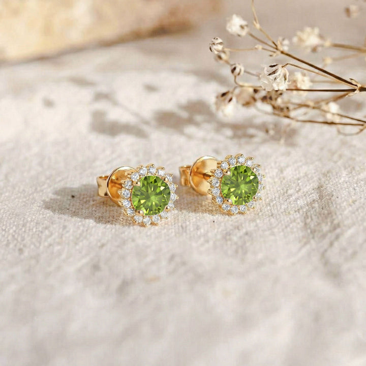 Peridot Round Halo Stud Earrings in Yellow Gold Plated 5 MM 1.3ct