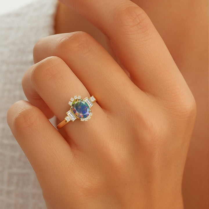 Blue Opal Halo Wedding Ring - Genuine Fire Opal