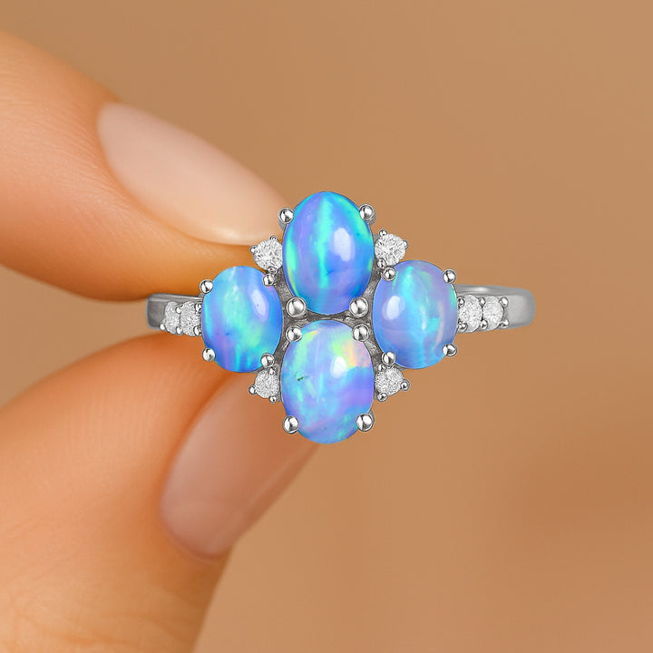 Oval Blue Opal Cluster Ring in Sterling Silver Elegant 6x4mm Gem