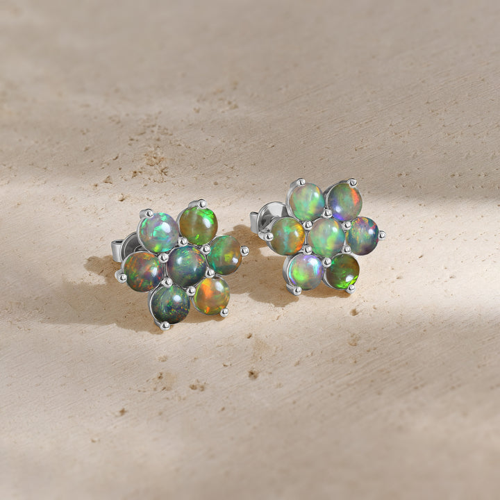 Black Opal Round Stud Earrings in 925 Silver Luxury 14-Stone Design