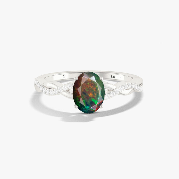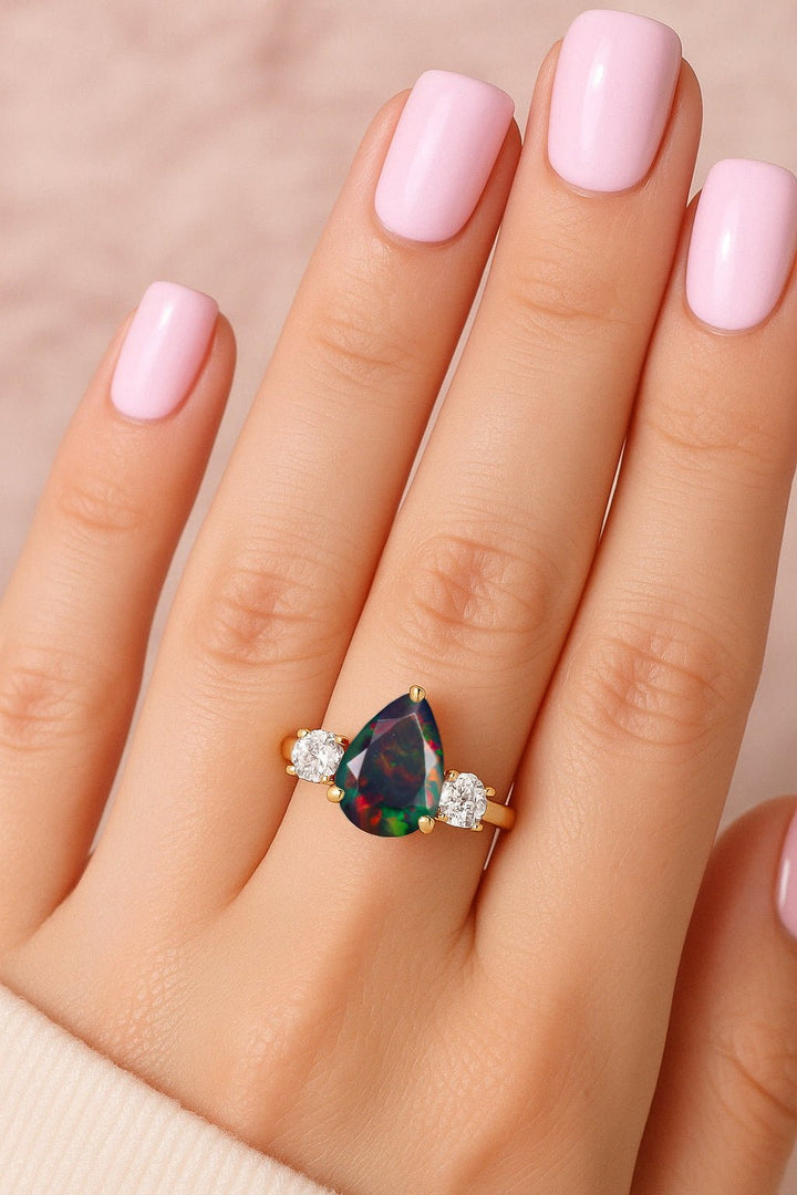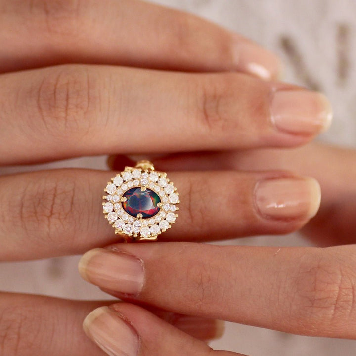 Black Opal Ring for Women with Zircon Halo