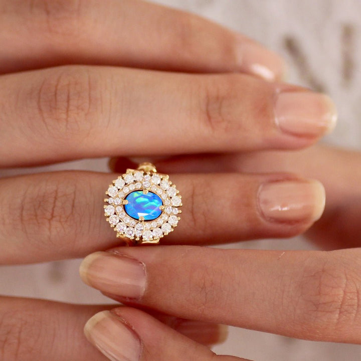 Oval Natural Blue Opal Ring - Halo Wedding Collection