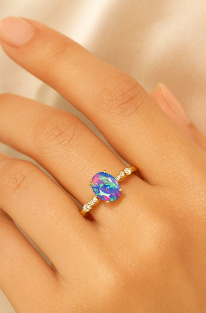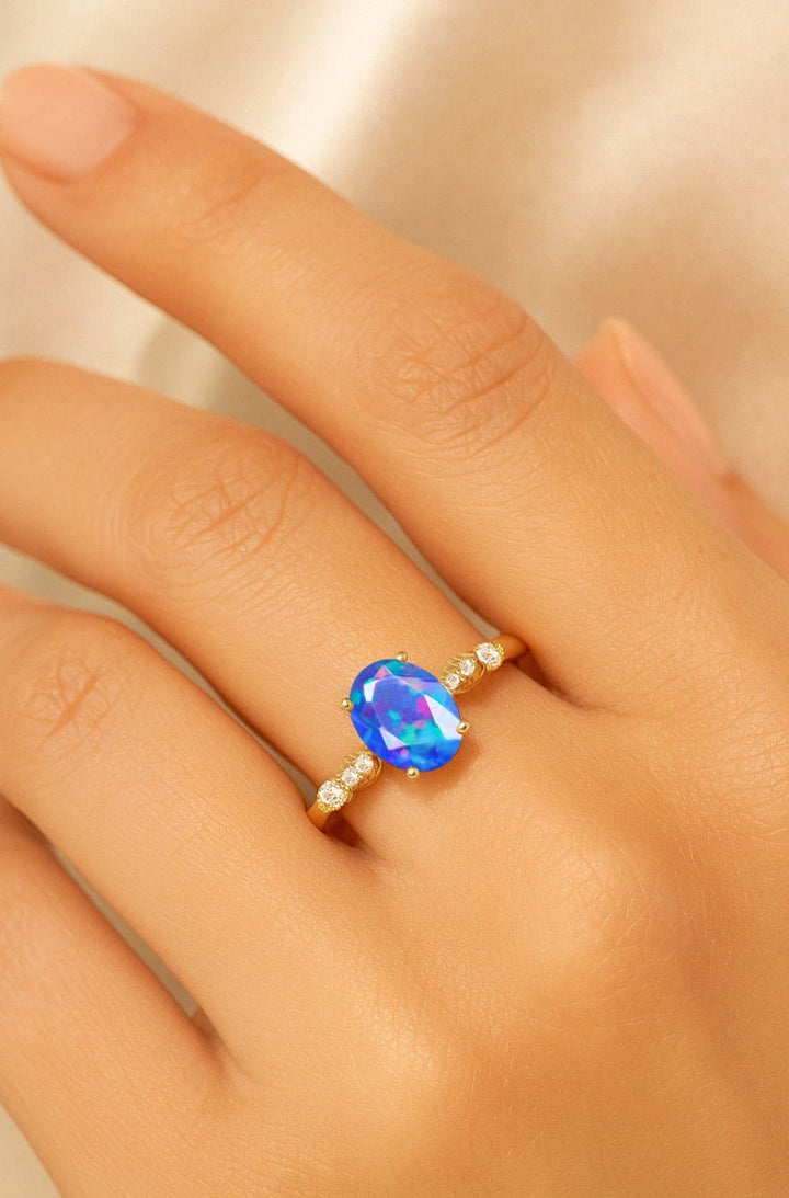 Natural Blue Opal with White Zircon Side Stone Solitaire Ring