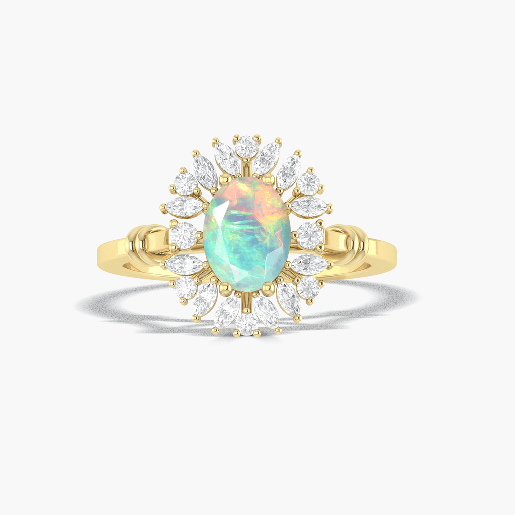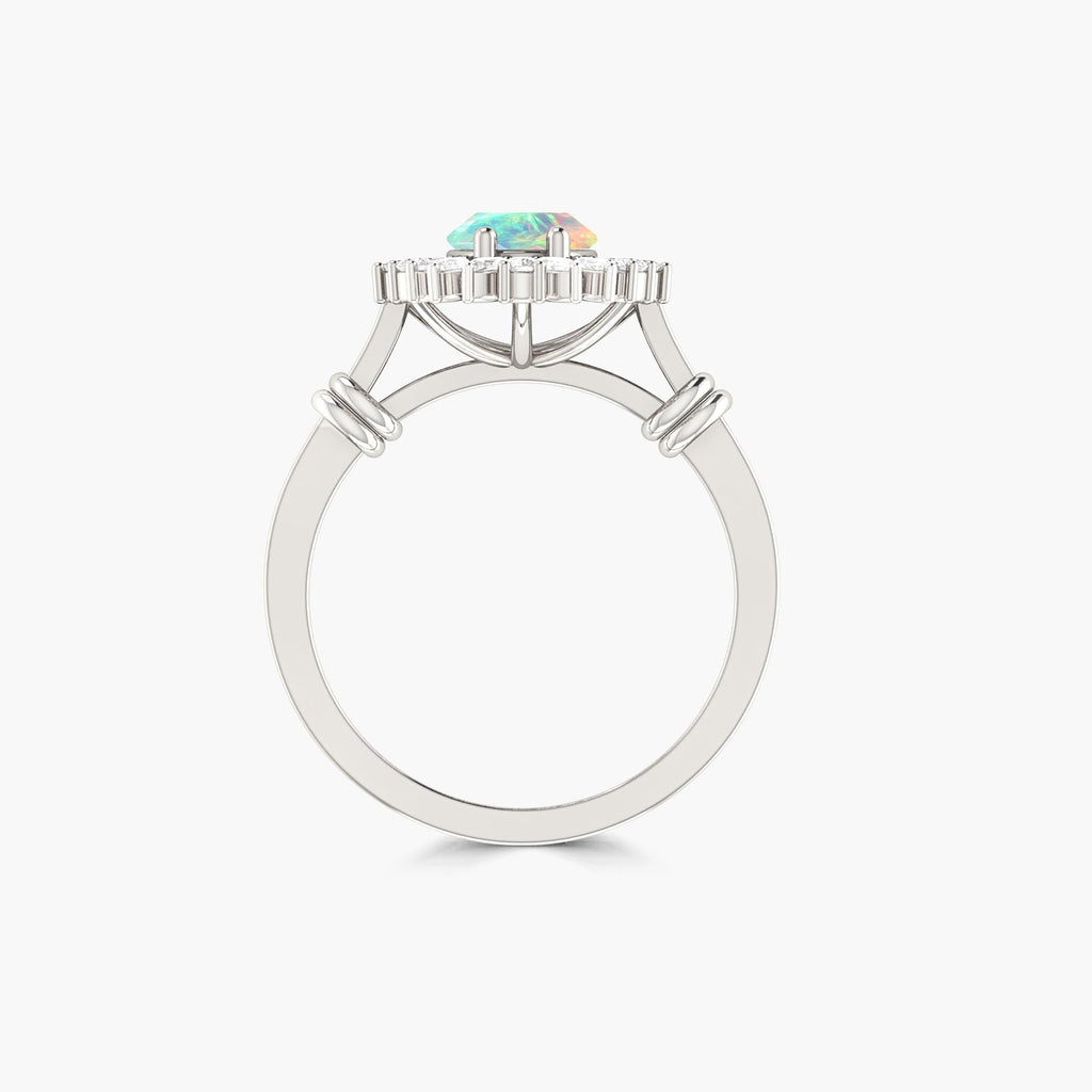 This beautiful white opal ring features natural Ethiopian opal with a stunning rainbow fire, set in a prong setting. Perfect for engagements or special occasions, this statement ring adds elegance and sophistication to any outfit. Feel confident and stylish with this unique and eye-catching piece.