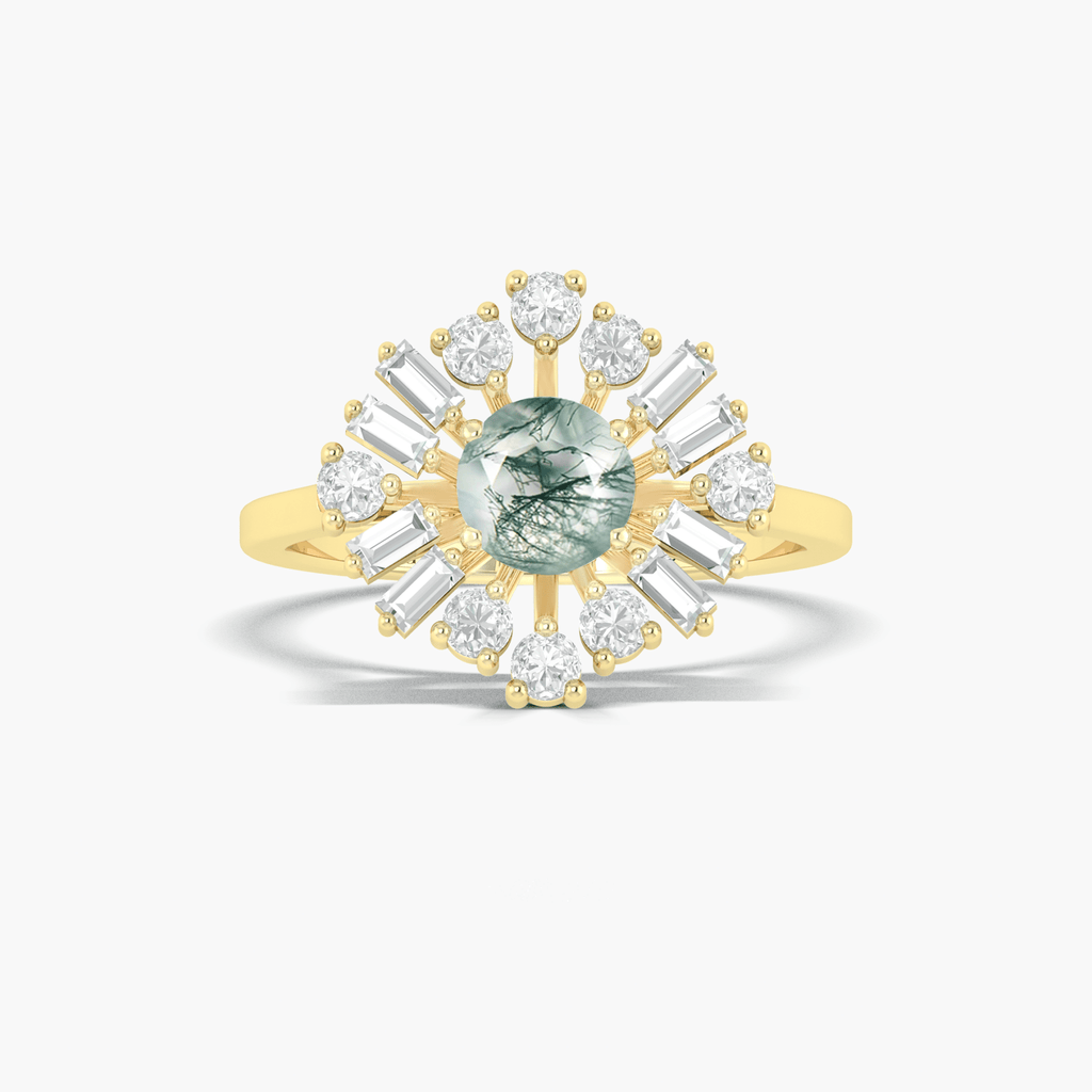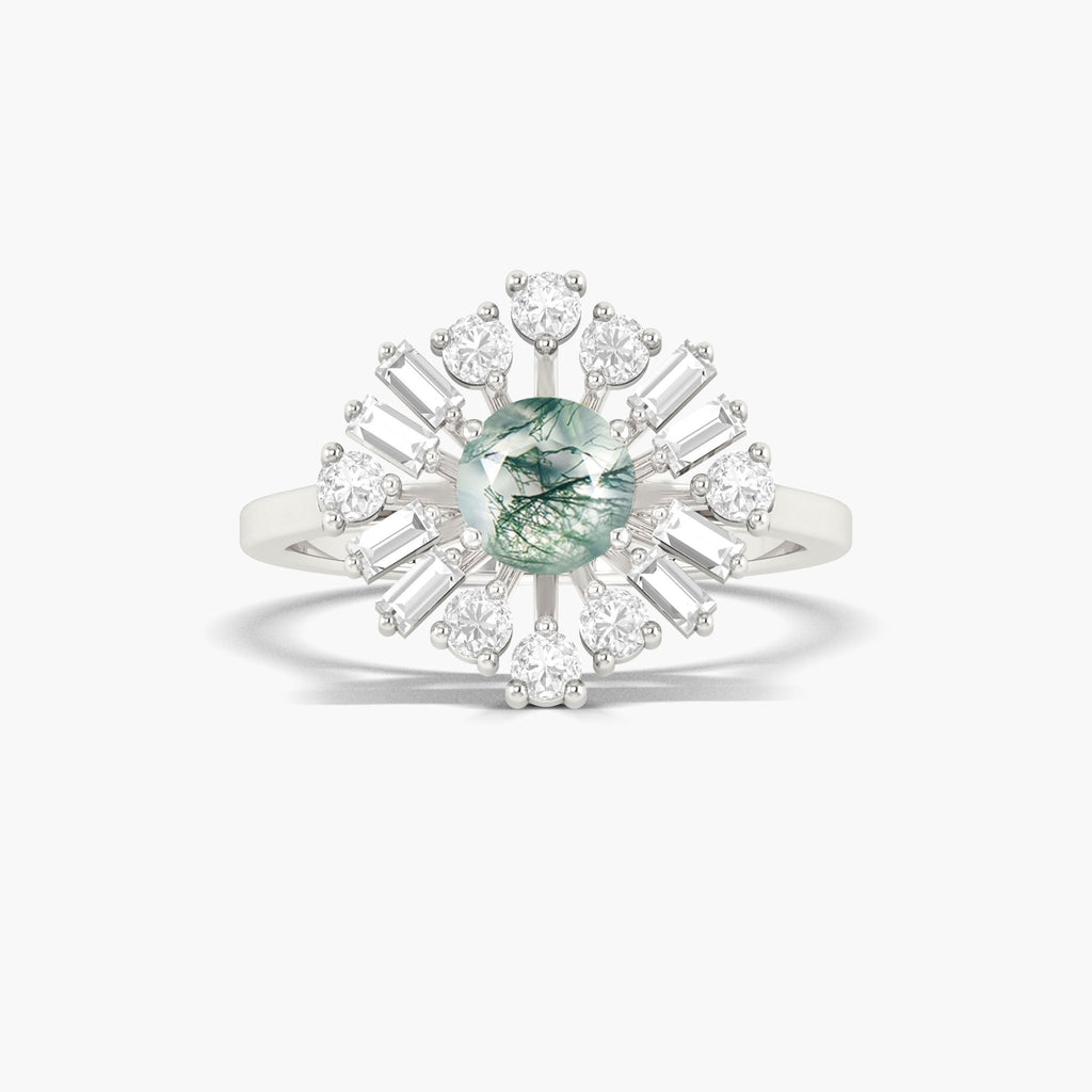 Crafted with a mesmerizing Round Moss Agate stone, this Engagement ring exudes beauty and elegance. Boasting a classic round cut, this stone is believed to bring a sense of balance and stability to its wearer, making it a thoughtful and meaningful choice for your special someone.