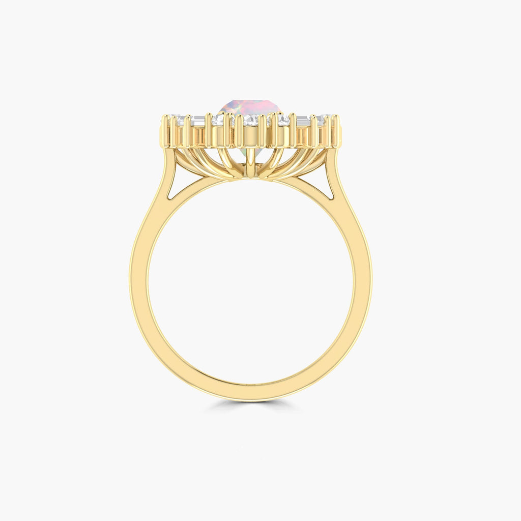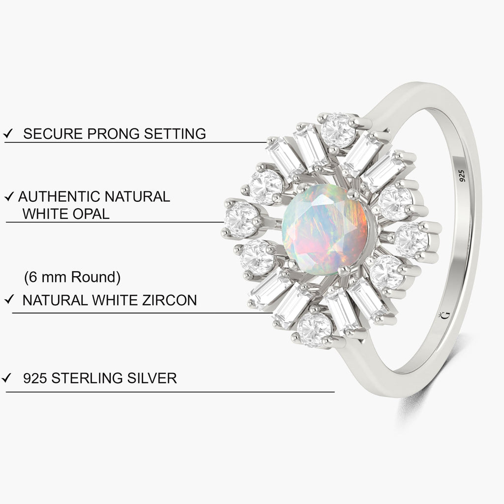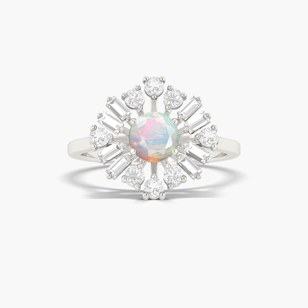 Crafted from a mesmerizing Ethiopian opal with a vintage fire, this round-shaped ring is adorned with sparkling zircons. The opal's fiery hues and the zircon's brilliance make it a perfect statement piece for any occasion. Elevate your style with this unique and timeless piece.
