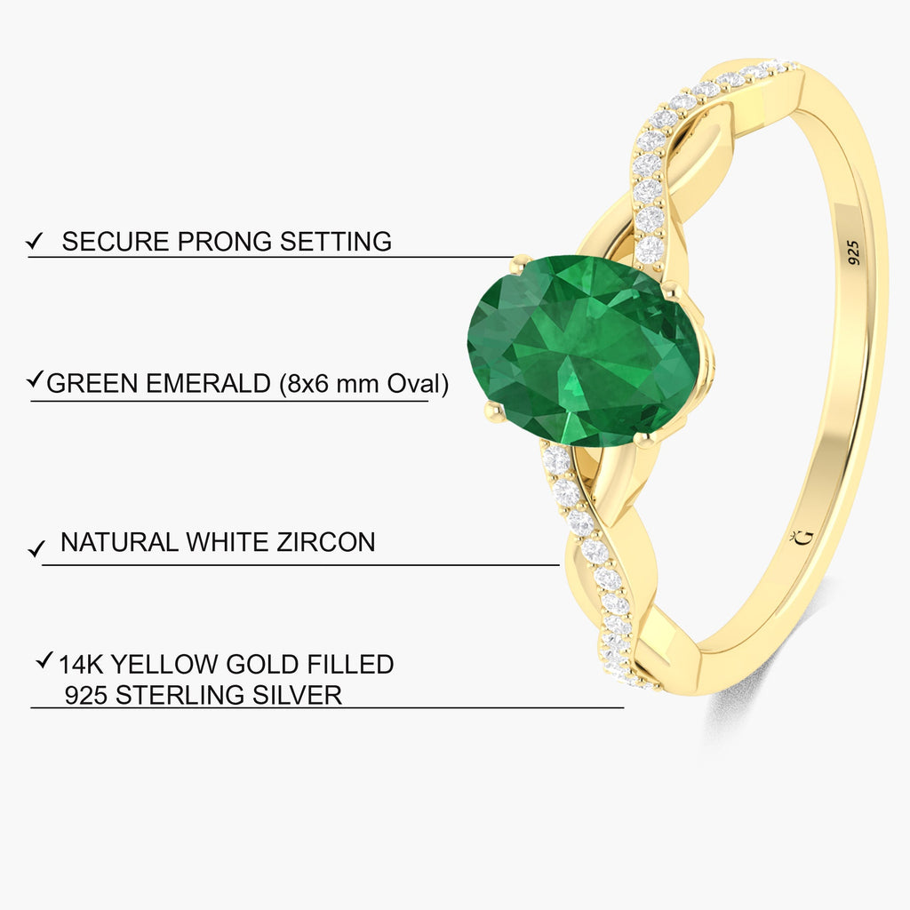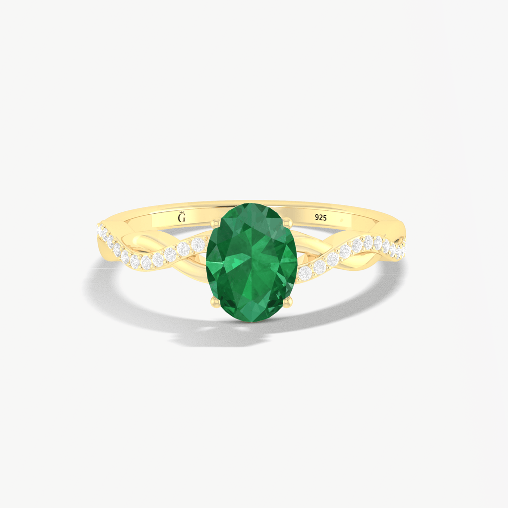 This elegant gold ring features a dainty oval-shaped green emerald set in prongs, creating a secure and luxurious setting. The beautiful emerald offers a touch of color and sophistication to any outfit, making it a timeless addition to your jewelry collection.
