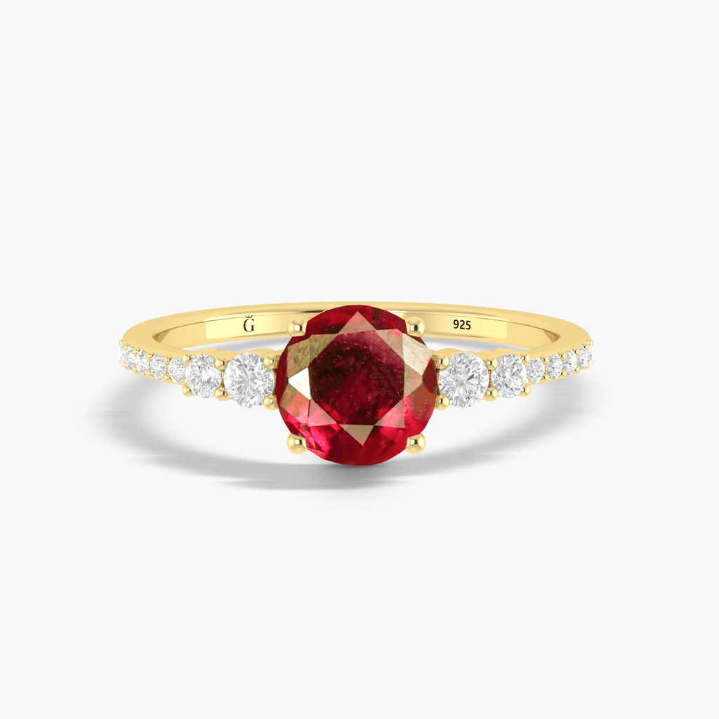 Take on new adventures with this bold and daring dainty round Ruby Wedding gold ring. Perfect for the risk-takers, it boasts a beautiful ruby gem that symbolizes passion and vitality. Make a statement with this elegant and timeless piece.