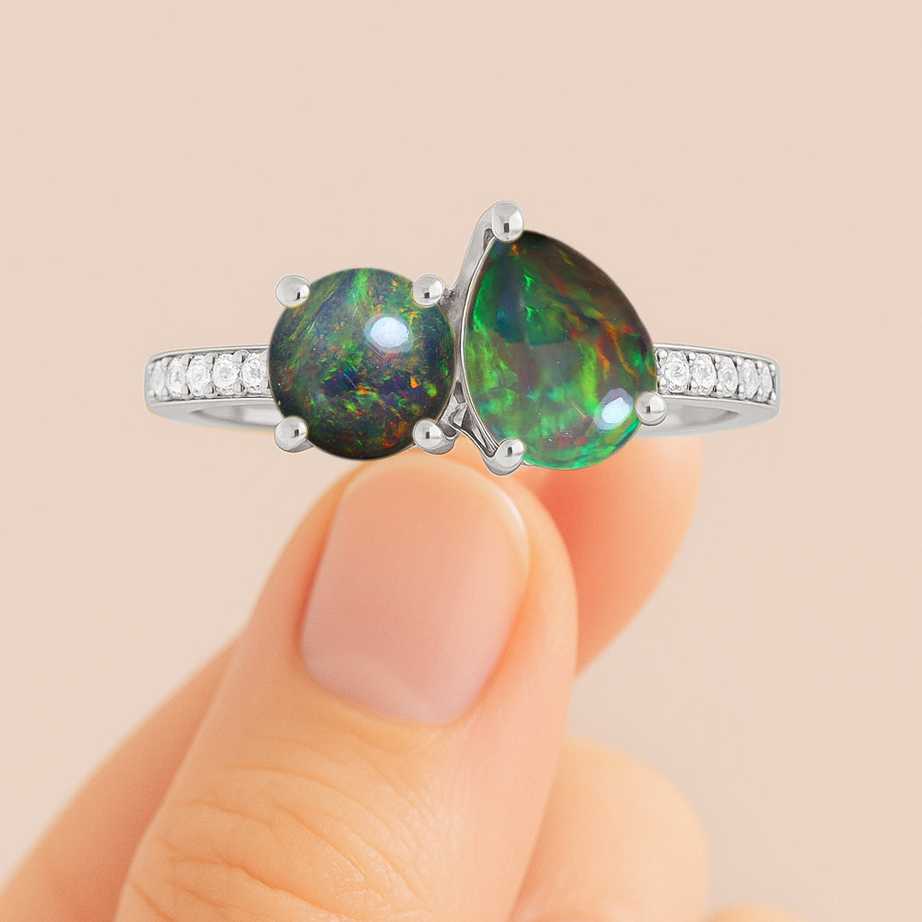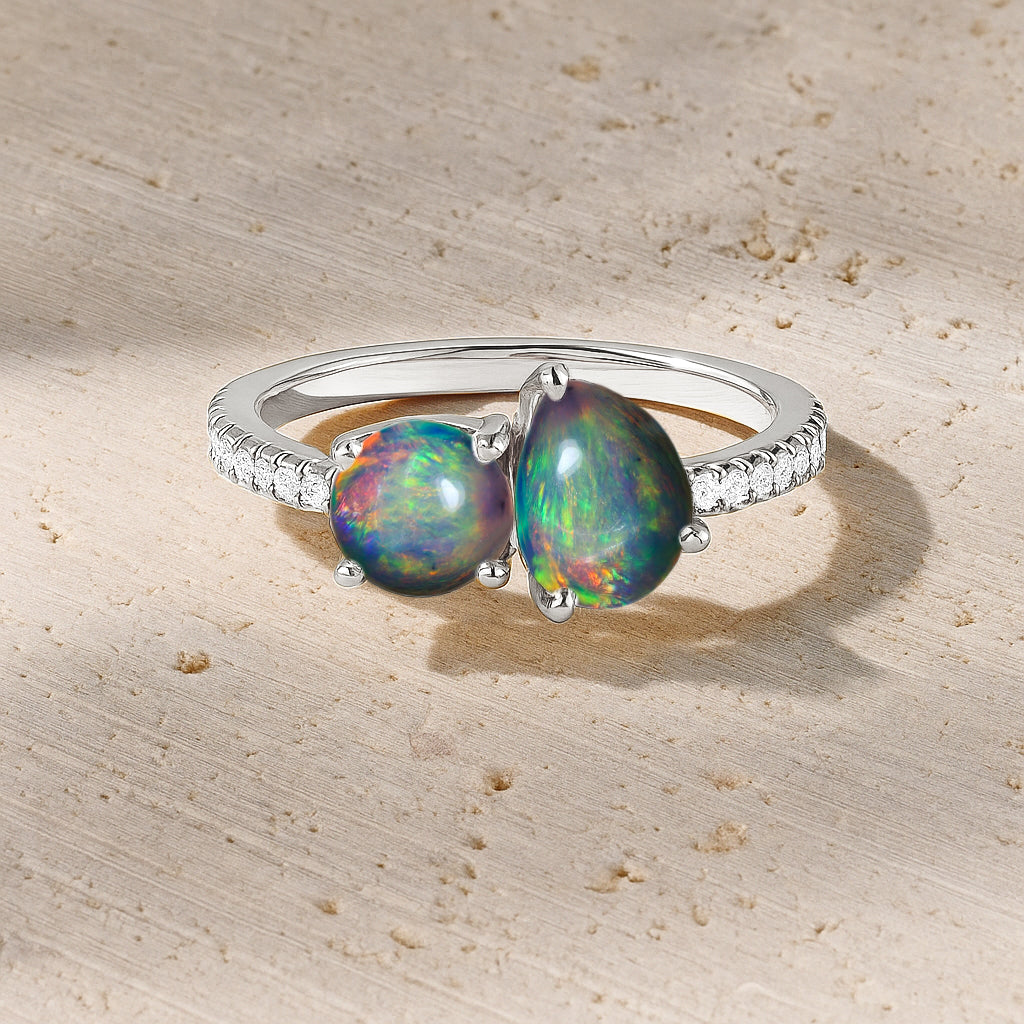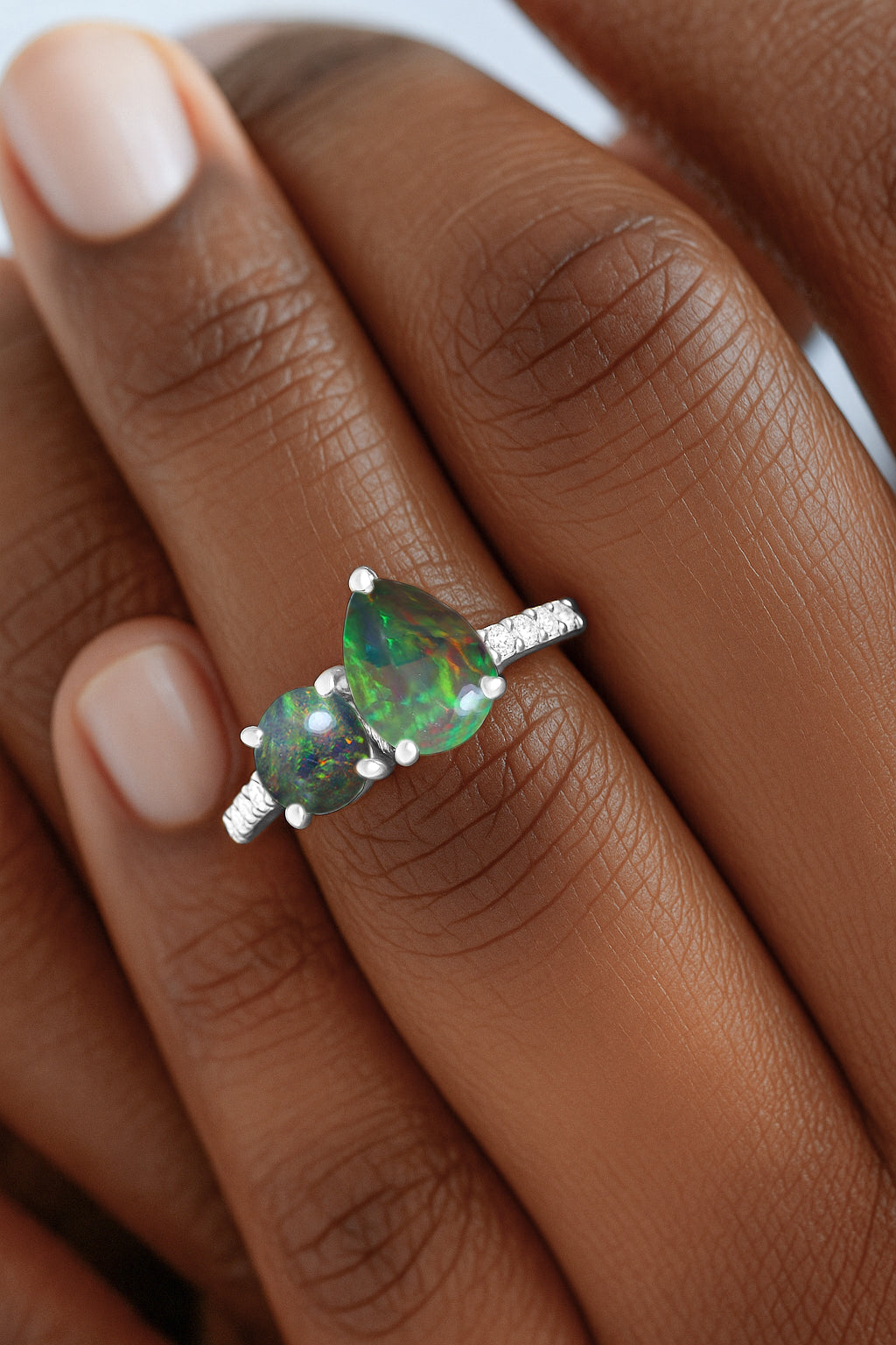 Black OpalDiscover the perfect blend of elegance and sophistication with this Two Stone Ring, crafted in premium 925 Sterling Silver. Featuring a luminous Black Opal pear shaped stone (8x6 mm) paired with a smooth round stone (6 mm), totaling 1.70 carats, this ring exudes timeless charm. Designed for comfort and style, it measures size 9.64 and weighs approximately 3.42 gm. Ideal for special occasions or daily wear, its versatile design makes it a captivating addition to any jewelry collection. Elevate your look with this exquisite, gift worthy piece that radiates refined luxury.