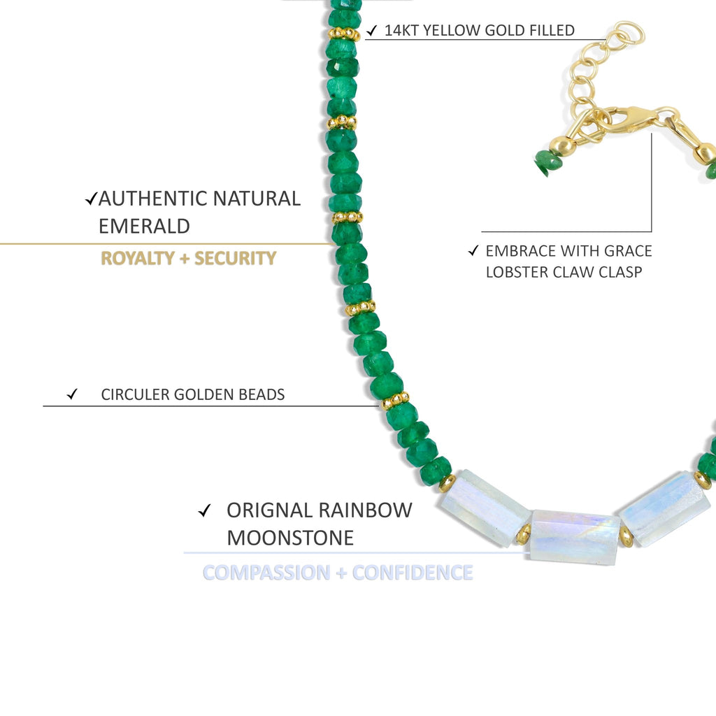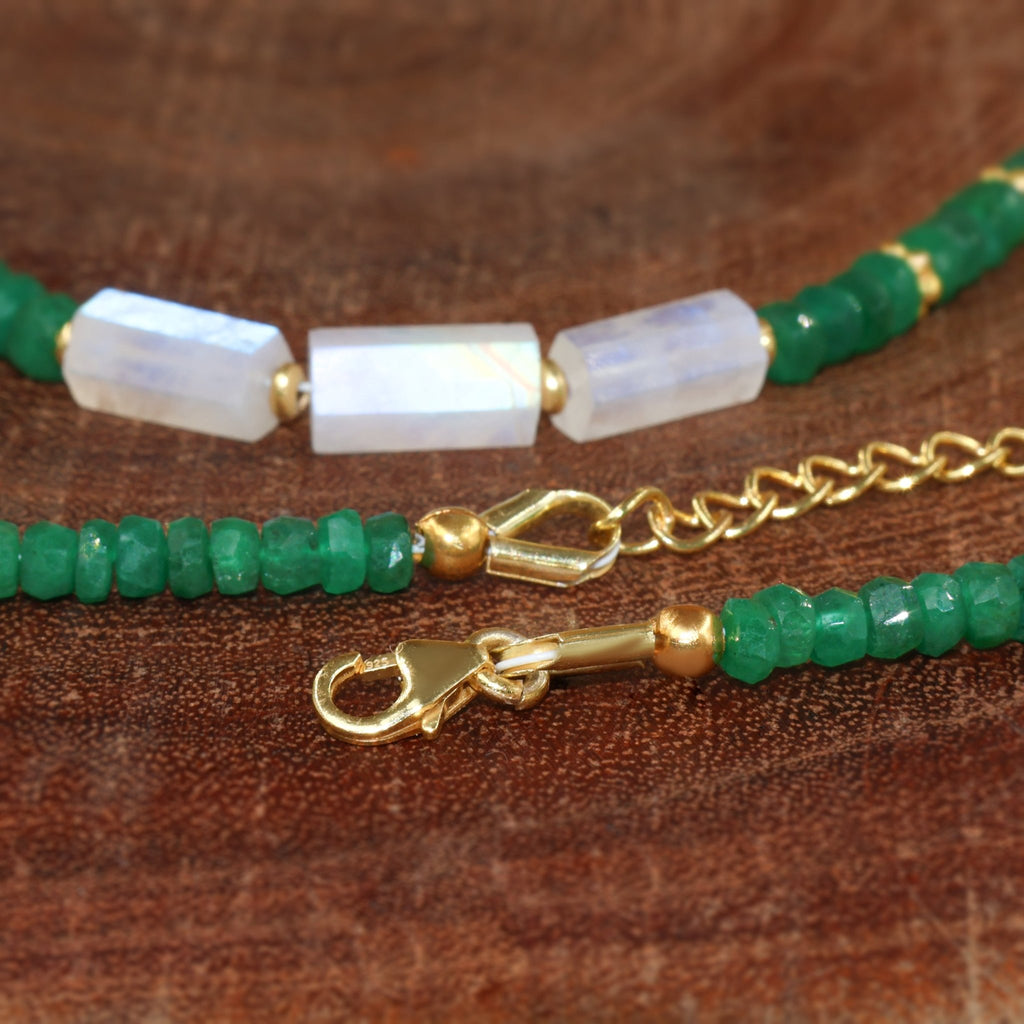 GOODSTONE JEWELS Natural Moonstone & Emerald Beaded Necklace : Elevate your jewelry collection with this stunning handcrafted necklace from GOODSTONE JEWELS. Featuring three pencil-cut natural moonstone and emerald stones, this elegant piece is designed in 925 sterling silver for a luxurious finish. Each bead is carefully selected for its natural beauty and healing properties, making this necklace not only a fashion statement but also a meaningful addition to your spiritual journey. With bead sizes of 3x5 mm rondelles and 6x12 mm pencils, the intricate craftsmanship highlights the rich textures and tones of the gemstones. Whether you're dressing up for a formal event or adding a touch of elegance to your everyday look, this versatile piece will complement any style.