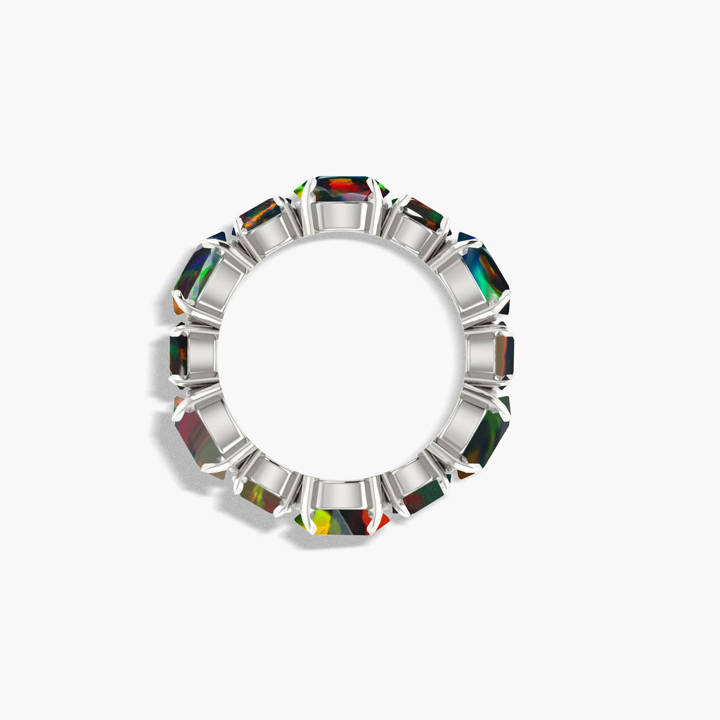 Black OpalNatural Black Opal Eternity Wedding Band Ring, masterfully crafted in 925 Sterling Silver. This captivating ring features twelve round faceted Black Opals, 6 mm and 4 mm stones, totaling 6.9 carats of mesmerizing brilliance. Each opal showcases the unique fire and vibrant play of colors that make this October birthstone truly unforgettable. Designed with a continuous row of genuine gemstones, this eternity band is the perfect symbol of love without end. Whether worn as a wedding band, promise ring, or stackable fashion ring, it offers timeless elegance and versatility for any occasion.