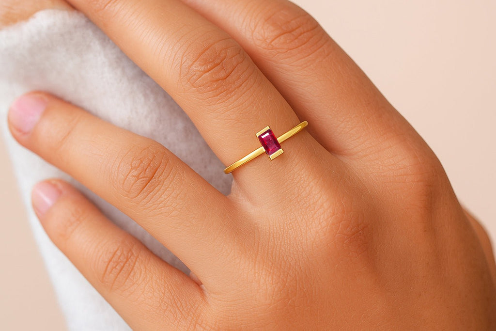 RubyRadiate confidence and passion with this stunning Natural Ruby Solitaire Ring, masterfully crafted in 925 Sterling Silver and enriched with a luminous Yellow Gold Plating. The centerpiece of this elegant design is a 1.2-carat baguette-cut Ruby, naturally sourced and precisely faceted to enhance its deep red brilliance and clarity. Set in a sleek and modern bar setting, the gemstone is showcased in a minimal yet bold fashion, making it a versatile choice for both everyday elegance and special moments. The solitaire style emphasizes the ruby’s vivid hue, offering a classic silhouette with a contemporary edge. Lightweight at 1.10 grams, this ring combines lasting comfort with fine craftsmanship. Whether you're looking for a signature accessory or a meaningful gift, this ruby ring captures the essence of timeless beauty and passionate expression.