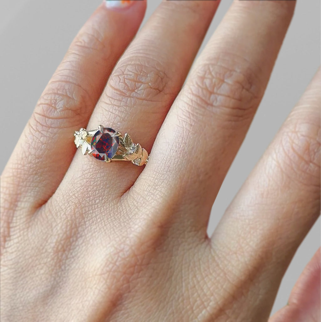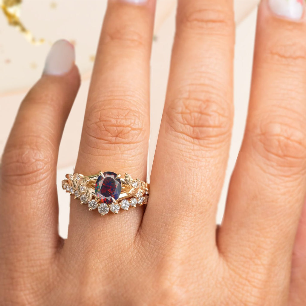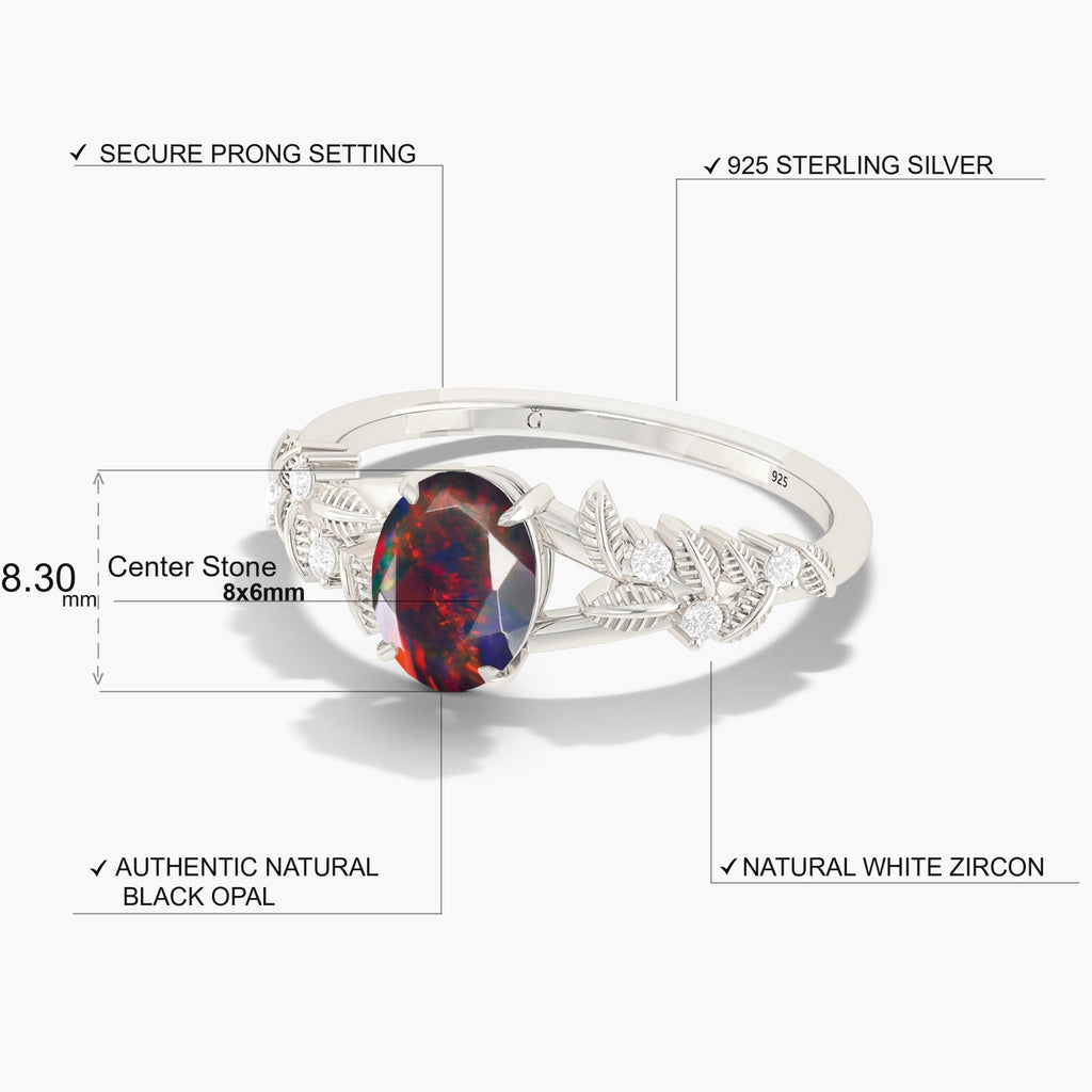 Black OpalNatural Black Opal Leaf-Style Solitaire Ring crafted in premium 925 Sterling Silver for a rich, radiant finish. This ring features a stunning 8x6 mm oval faceted black opal weighing 1.0 carat. Its natural fire and iridescence make it a captivating centerpiece. The unique leaf design embodies natural beauty, making this piece perfect for women who appreciate both modern artistry and organic inspiration. Whether you’re looking for a meaningful birthstone ring, a distinctive engagement ring alternative, or a heartfelt gift for her, this ring is a timeless choice.