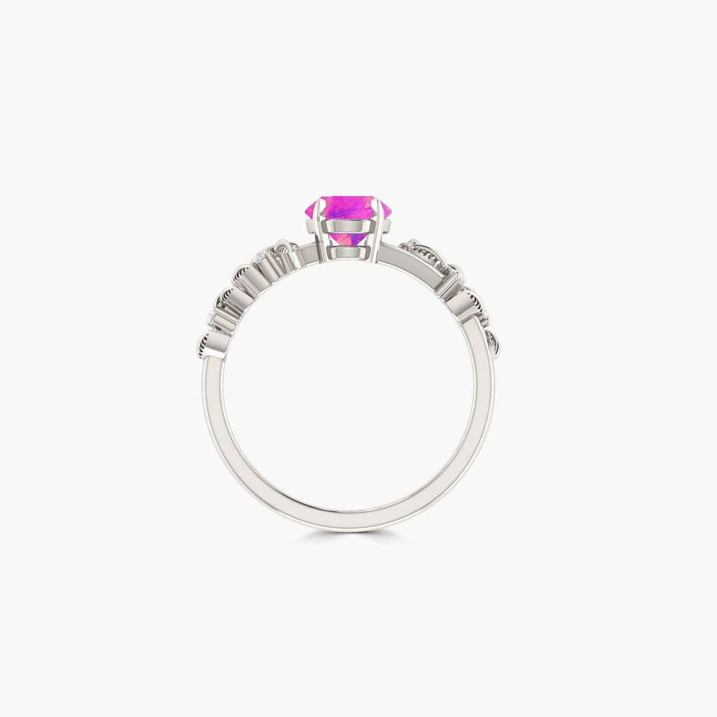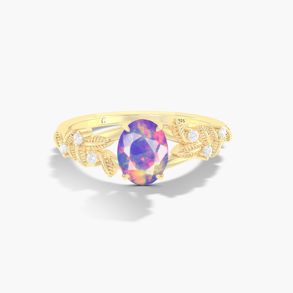 Lavender OpalNatural Lavender Opal Leaf Style Solitaire Ring crafted in premium 925 Sterling Silver and yellow gold-filled for a rich, radiant finish. This ring features a stunning 8x6 mm oval faceted Lavender opal weighing 1.0 carat. Its natural fire and iridescence make it a captivating centerpiece. The unique leaf design embodies natural beauty, making this piece perfect for women who appreciate both modern artistry and organic inspiration. Whether you’re looking for a meaningful birthstone ring, a distinctive engagement ring alternative, or a heartfelt gift for her, this ring is a timeless choice.
