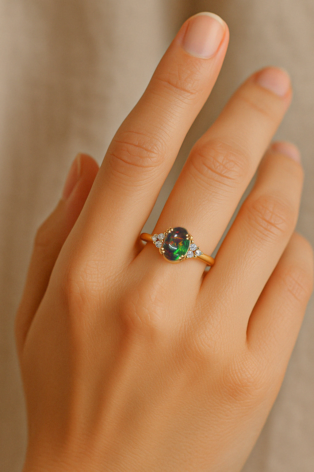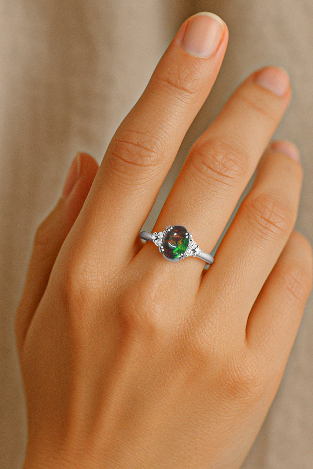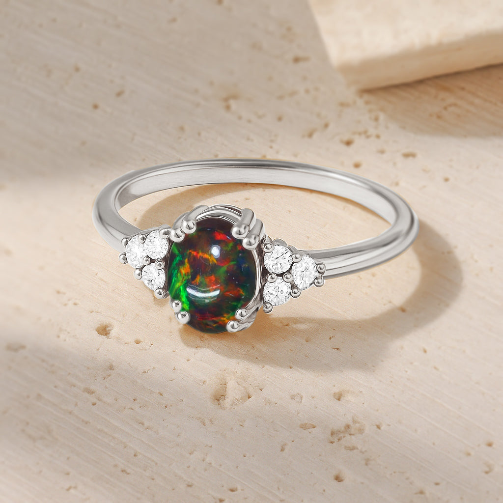Black OpalElevate your jewelry collection with this stunning Black Opal Oval Solitaire Ring, expertly crafted in premium 925 Sterling Silver. The centerpiece features a smooth 8x6 mm oval black opal, glowing with its signature play of color and offering a refined 0.9 carat brilliance. Its elegant, minimalist setting enhances the stone’s natural beauty while ensuring durability and comfort for daily wear. Weighing approximately 3.10 gm, this ring is both lightweight and luxurious. Perfect for special occasions, thoughtful gifting, or adding a touch of sophistication to your everyday style, this timeless piece brings modern elegance and radiant charm to any look.