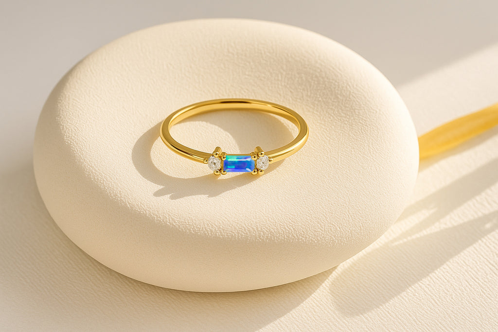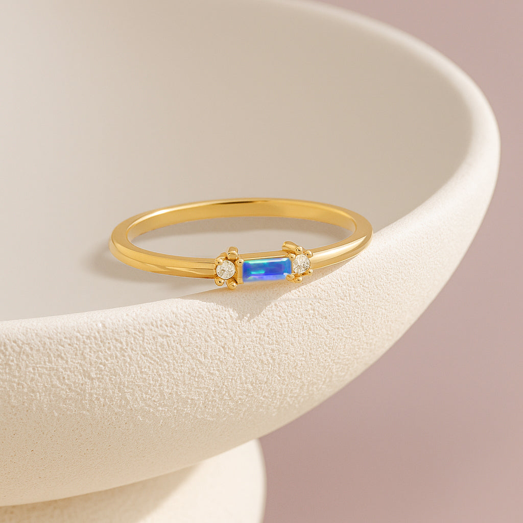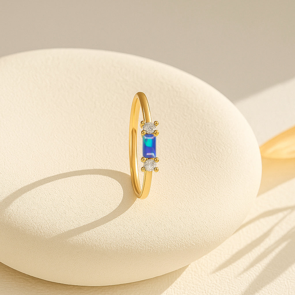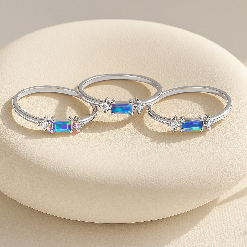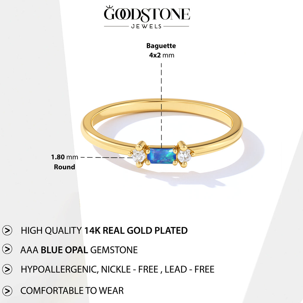 Blue OpalExperience timeless elegance with this Blue Opal Baguette Solitaire Ring, beautifully crafted in 925 sterling silver. The design features a striking 4x2 mm baguette cut natural blue opal, showcasing a vivid red hue and a refined minimalist silhouette. With a gemstone weight of 0.20 carat, this ring offers subtle brilliance perfect for daily wear or special occasions. Its sleek silver band complements the stone’s clean lines, making it a sophisticated addition to any jewelry collection.