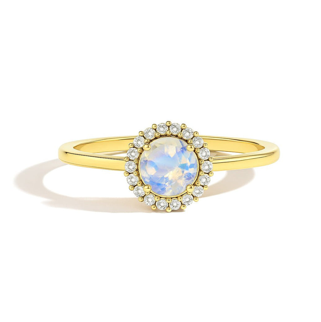MoonstoneAdd a touch of celestial beauty to your jewelry collection with this enchanting Natural Moonstone Halo Ring, expertly crafted in 925 Sterling Silver and finished with luxurious Yellow Gold Plating. At the heart of this elegant design sits a 6mm round faceted moonstone, weighing 0.8 carats, known for its soft glow and mesmerizing iridescence. Surrounded by a classic halo setting, the moonstone is enhanced to radiate timeless charm and subtle sophistication. The delicate play of colors within the natural stone adds an ethereal feel, making this ring a perfect blend of grace and modern style. With a sturdy metal weight of 3 grams, this ring ensures durability while maintaining a lightweight, comfortable fit. The faceted cut brings out the moonstone’s natural shimmer, offering a radiant accent for both everyday wear and special occasions.