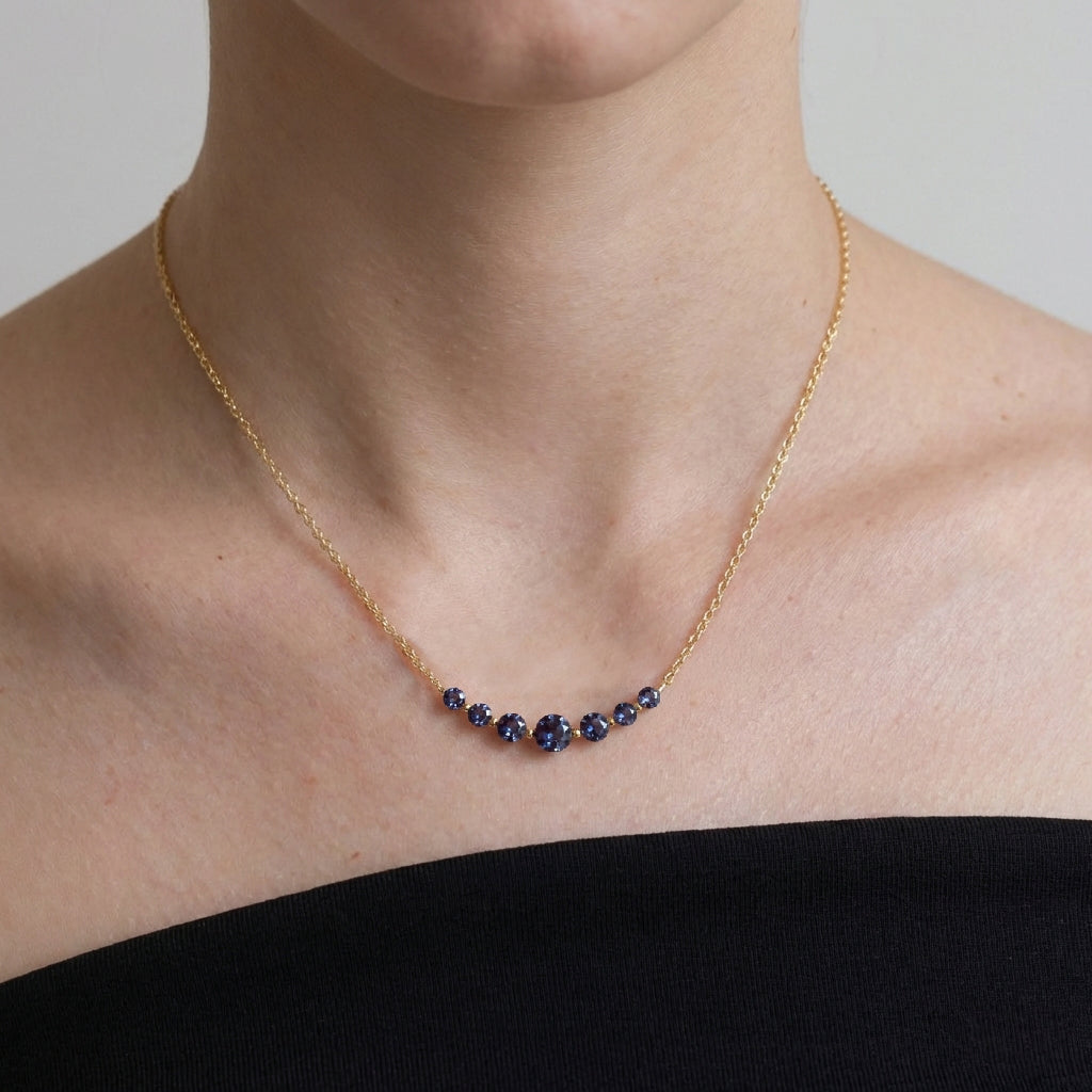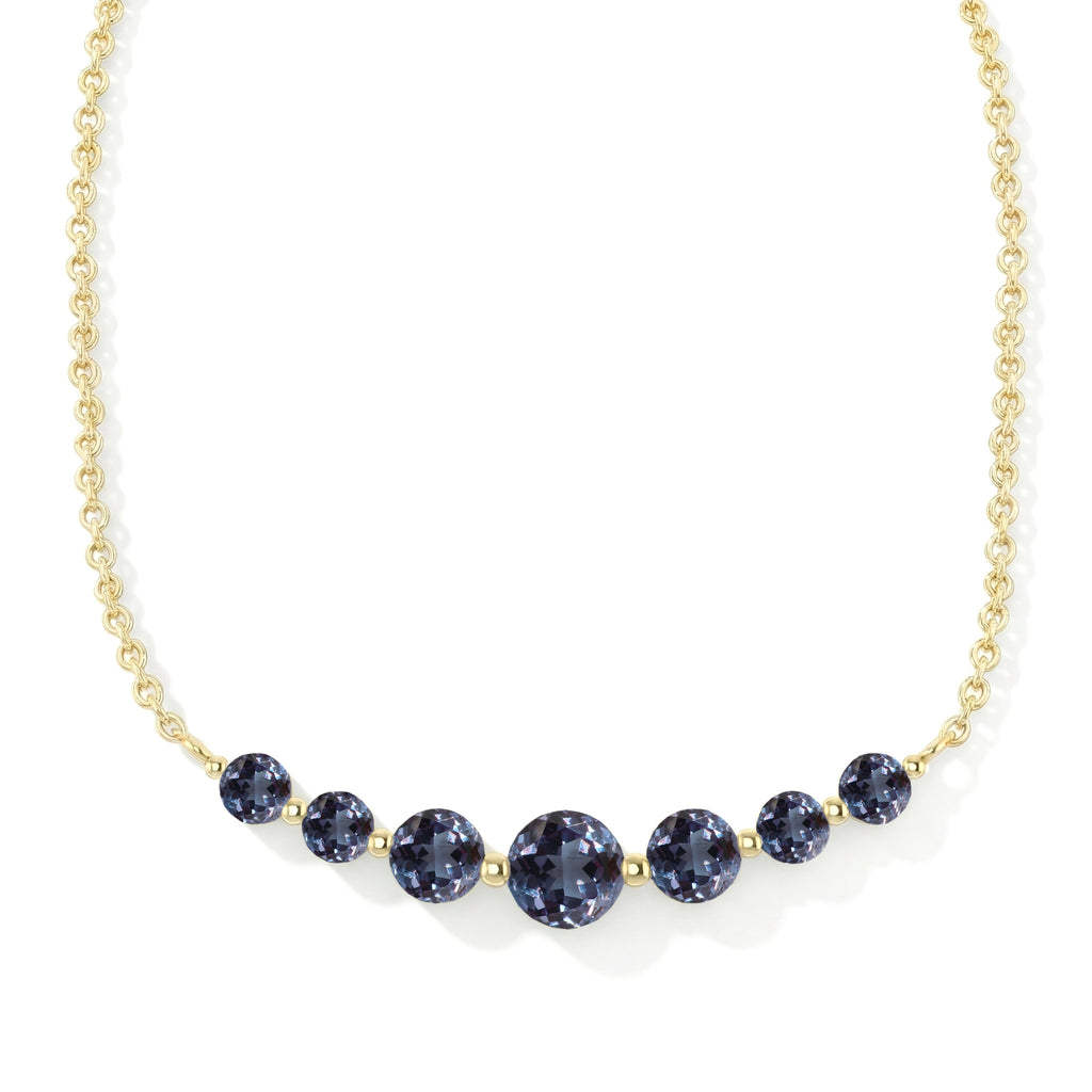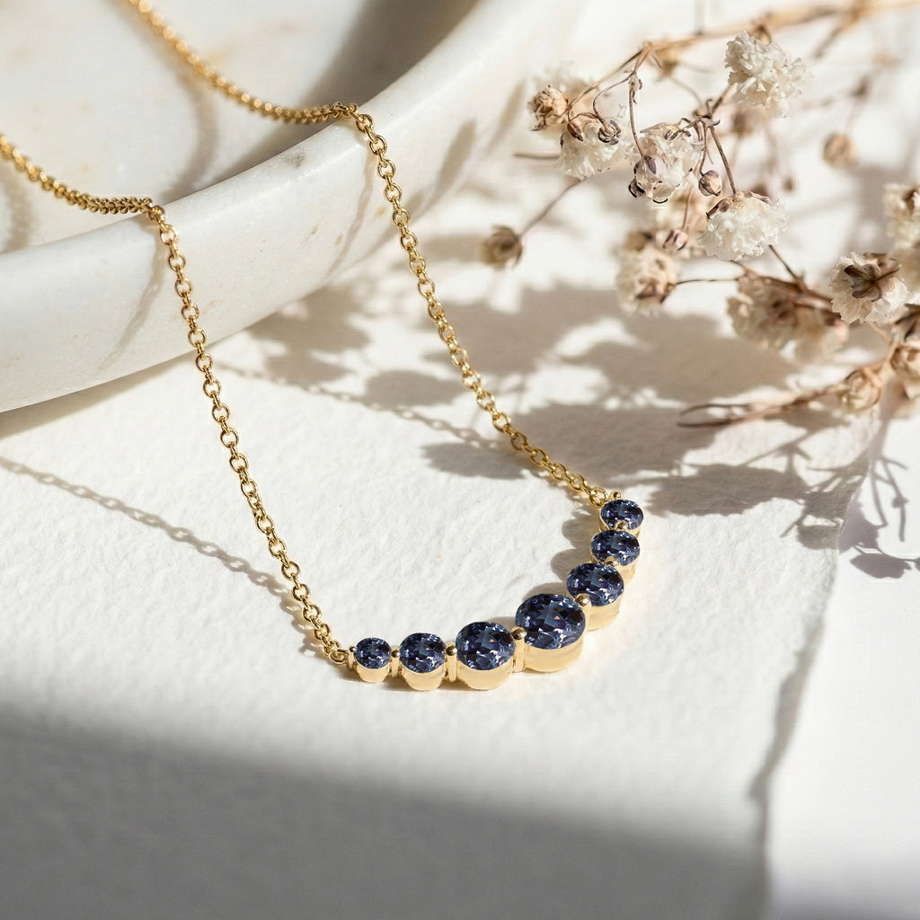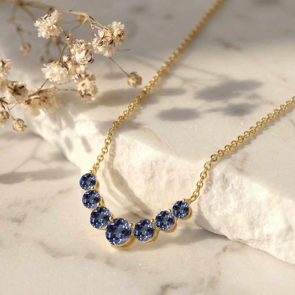 Elevate your style with this Alexandrite Curved Bar Pendant Necklace, crafted in yellow gold-plated brass. Featuring round faceted alexandrites in sizes 5mm, 4mm, and 3mm, totaling approximately 2.55 carats, the curved bar pendant measures 33.50 mm and hangs on a 16"+2" cable chain. Lightweight at 4.15g, it’s perfect for layering or wearing solo. Ideal as a birthstone jewelry gift or a modern statement piece, this necklace adds shimmering elegance and unique color-changing sparkle to any outfit.