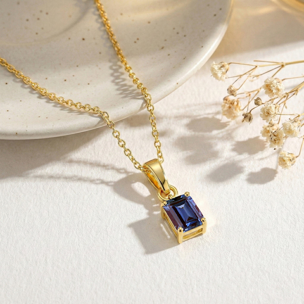 Experience the unique allure of color-changing beauty with this Alexandrite Octagon Solitaire Pendant Necklace. Featuring a faceted 9x7 mm octagon-shaped alexandrite (approx. 1.4 carats), this elegant pendant is set in yellow gold plated brass for a polished, radiant finish. Measuring 17.70 x 7 mm, it hangs from a 16” + 2” adjustable cable chain with a secure lobster clasp. Perfect for everyday elegance or as a thoughtful gift for someone special.