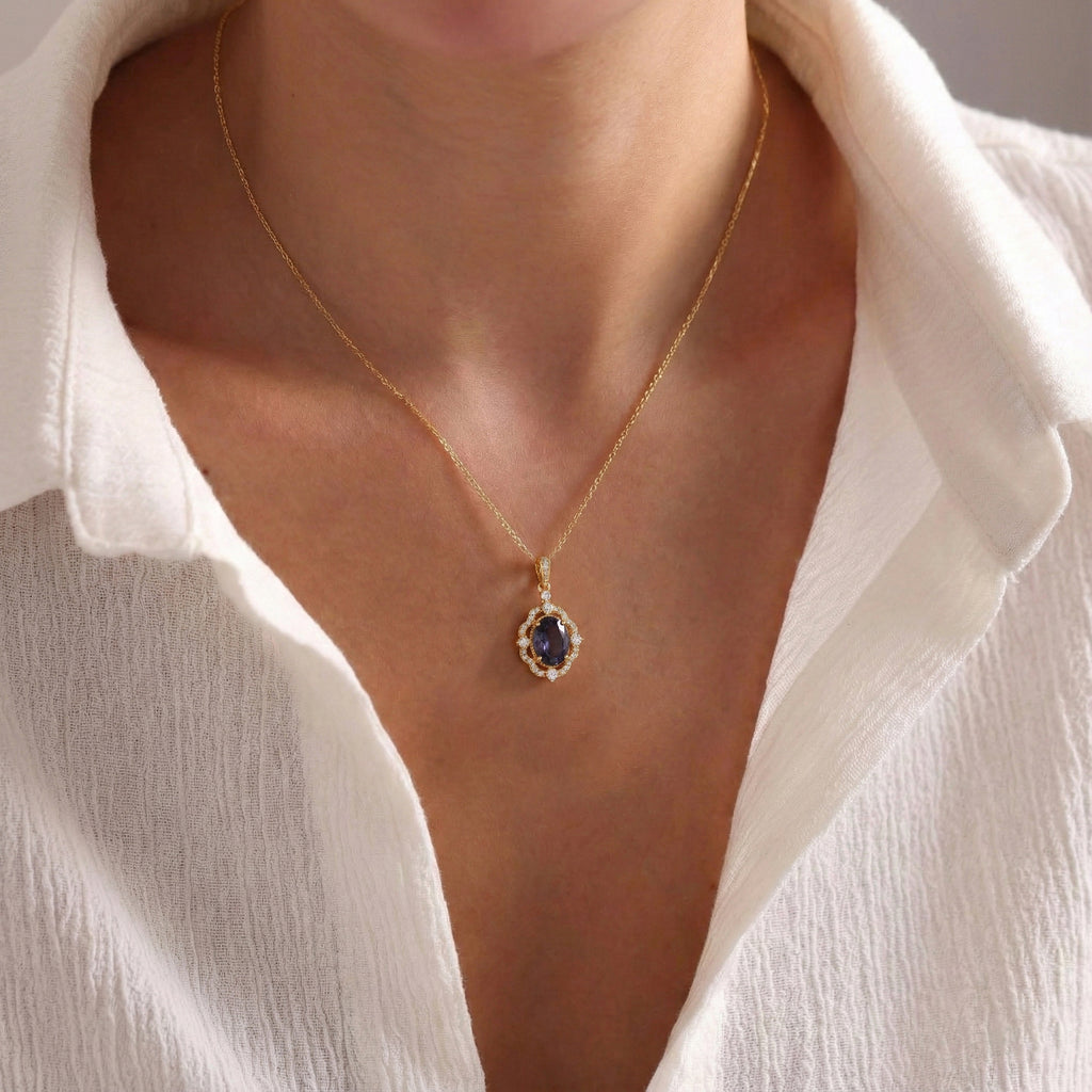 Experience captivating color with this Alexandrite Oval Halo Pendant Necklace in yellow gold-plated brass. Featuring a 1.2ct faceted oval alexandrite surrounded by sparkling CZ stones, the 25x12mm pendant hangs on a 16"+2" adjustable cable chain. Lightweight at 3.5g, it’s perfect for everyday elegance, special occasions, or as a thoughtful gift for someone special.