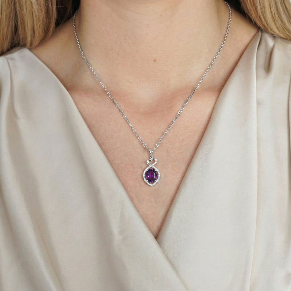 Natural Amethyst Oval Infinity Twist Heart Pendant Necklace in 925 Sterling Silver features a 1.2ct oval-cut amethyst (8x6mm) set in a stylish infinity twist heart design, accented with 2ct cubic zirconia for extra sparkle. The pendant measures 24.55 x 11.64mm and hangs from a 16” + 2” adjustable cable chain with a secure lobster clasp. Crafted from premium sterling silver, this elegant necklace showcases rich purple hues, romantic charm, and timeless sophistication—perfect for gifting or adding a standout piece to any jewelry collection.