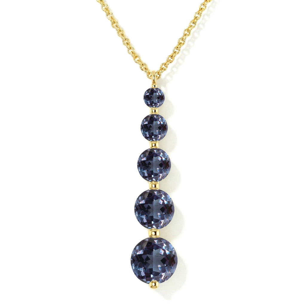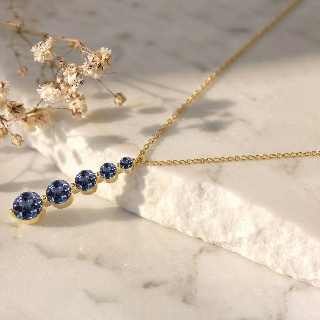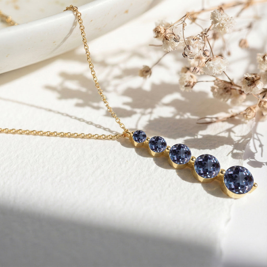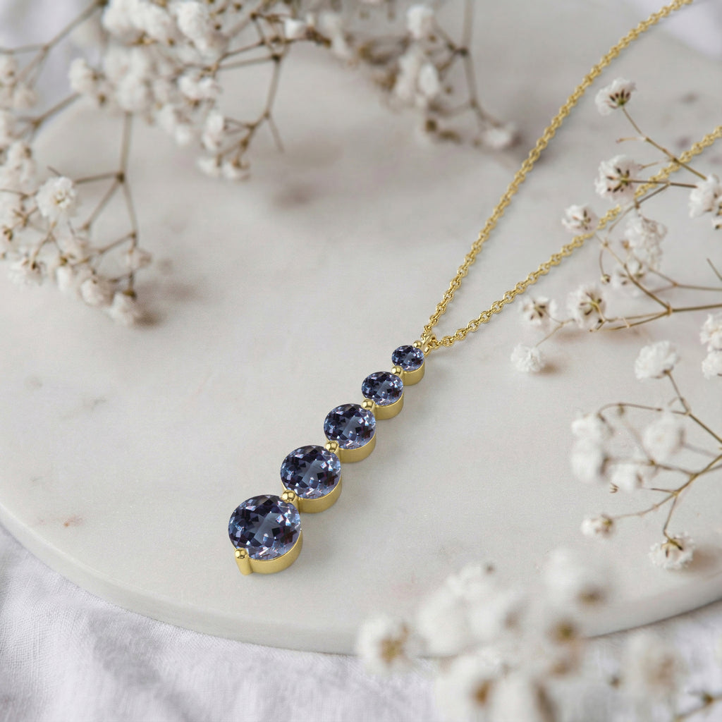 Experience captivating elegance with this Alexandrite Round 5-Stone Bar Pendant Necklace, crafted in yellow gold-plated brass. Featuring five faceted alexandrites ranging from 3mm to 7mm (total 3.90 carats), the pendant measures 34.76 x 7.30 mm and hangs on a 16"+2" cable chain. Lightweight yet striking at 6.65g, it’s perfect for layering or wearing solo. Ideal as a birthstone jewelry gift or a standout statement piece, this necklace adds a unique, color-changing sparkle to any outfit.