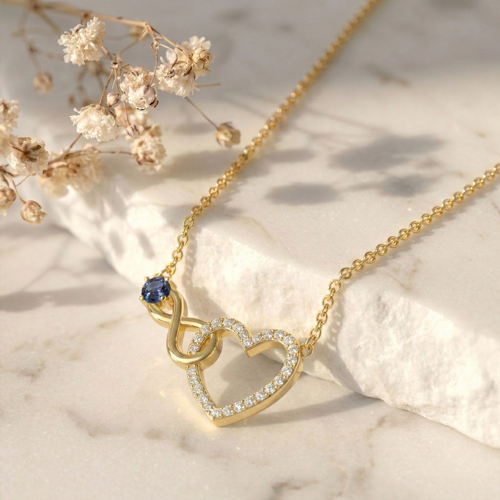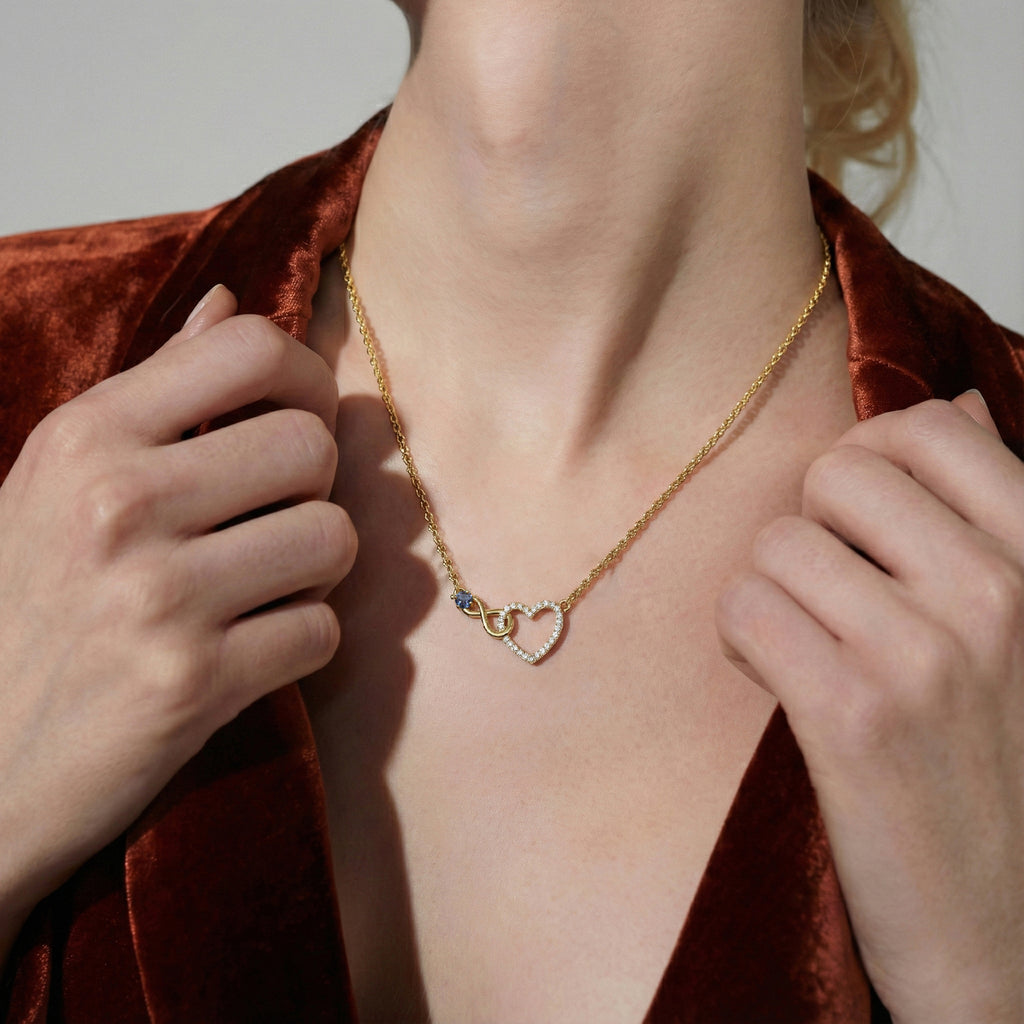Experience timeless elegance with this Alexandrite Round Infinity Heart Pendant Necklace in yellow gold-plated brass. Featuring a 0.45 ct, 4 mm round faceted alexandrite, the pendant measures 31.94 x 17.64 mm and hangs on a 16"+2" adjustable cable chain. Weighing 8 g with chain, it’s perfect for everyday wear or special occasions. The color-changing alexandrite paired with the romantic infinity heart design makes this necklace a meaningful gift for anniversaries, birthdays, or celebrating love and special moments.
