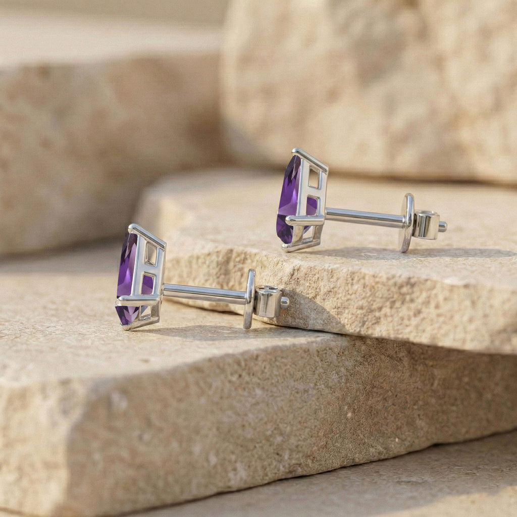 Add a pop of vibrant purple to your look with these Natural Amethyst Kite Stud Earrings crafted in solid 925 sterling silver. Featuring four 7x5 mm kite-shaped faceted amethyst stones totaling approximately 1.50 carats, these studs offer brilliant sparkle and rich color. Each earring measures 8.05 x 6.09 mm with a total weight of 1.05 grams, ensuring a lightweight and comfortable fit. Perfect as a February birthstone gift or elegant everyday jewelry, these sterling silver amethyst earrings blend modern design with timeless beauty.