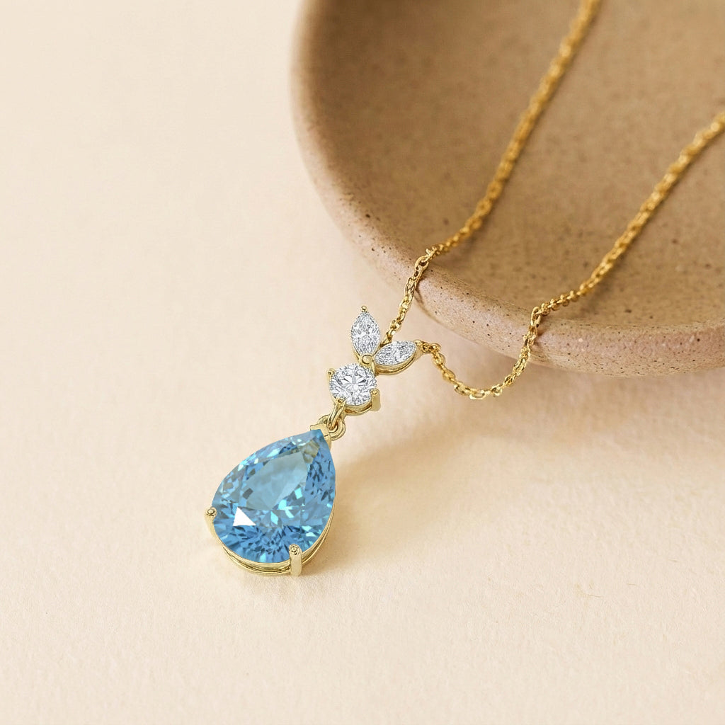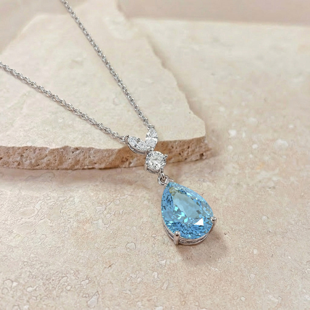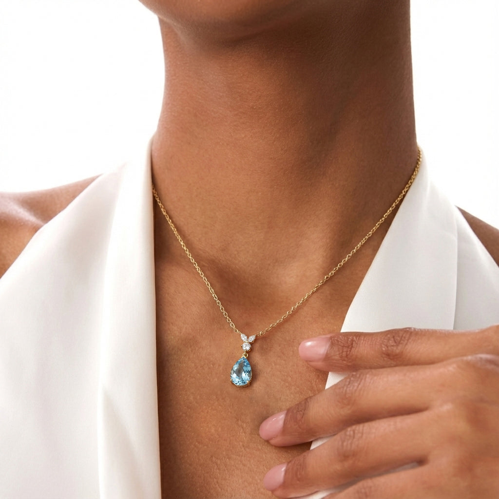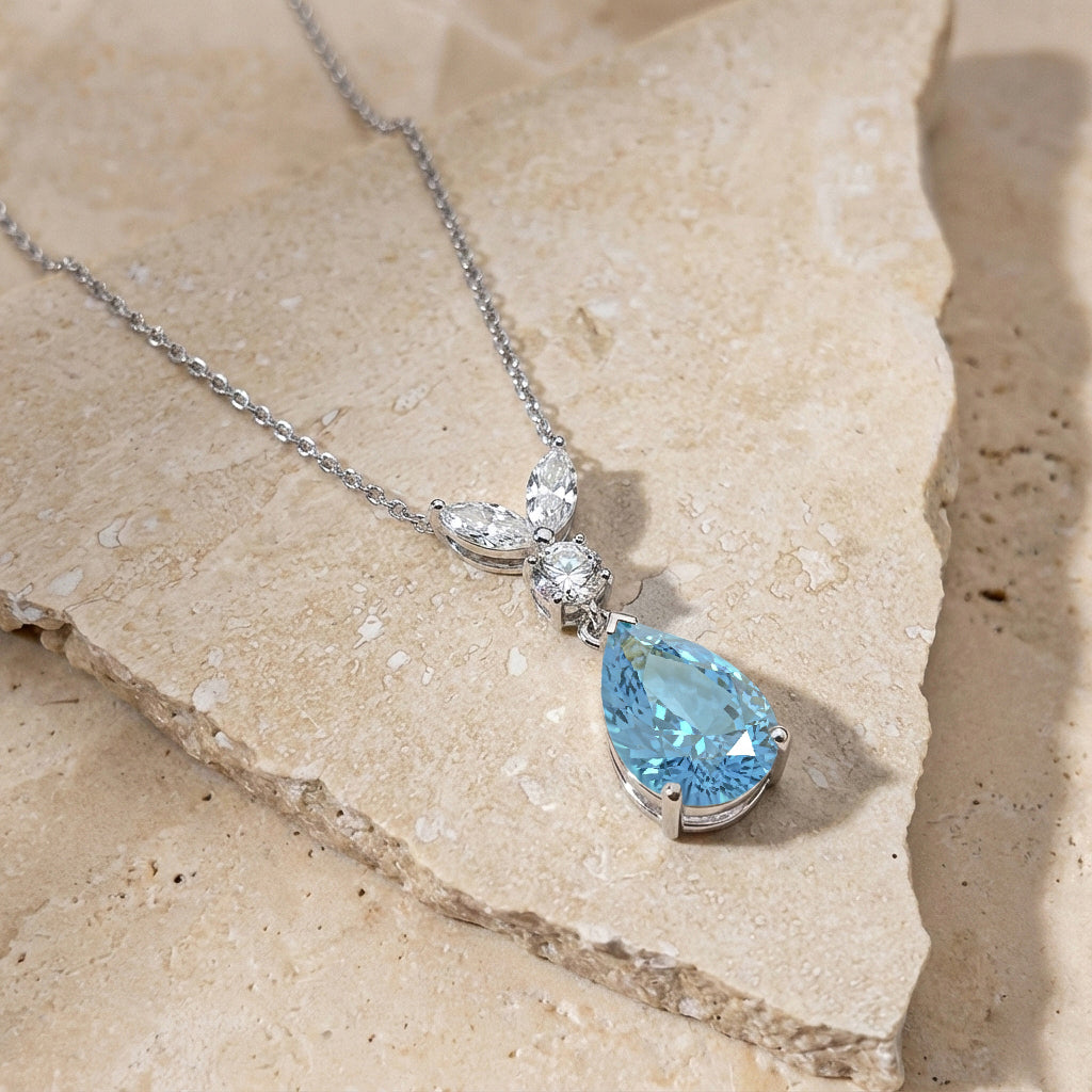 This Aquamarine Pear Teardrop Pendant Necklace is crafted in 925 sterling silver and features a 1.70 CT faceted pear-shaped Aquamarine (10x7 mm). The pendant measures 21.06 x 7.31 mm and weighs approximately 1.70 g. It comes with a 16” + 2” adjustable sterling silver cable chain and a secure lobster clasp. A timeless blue gemstone necklace perfect for everyday elegance or special occasions.