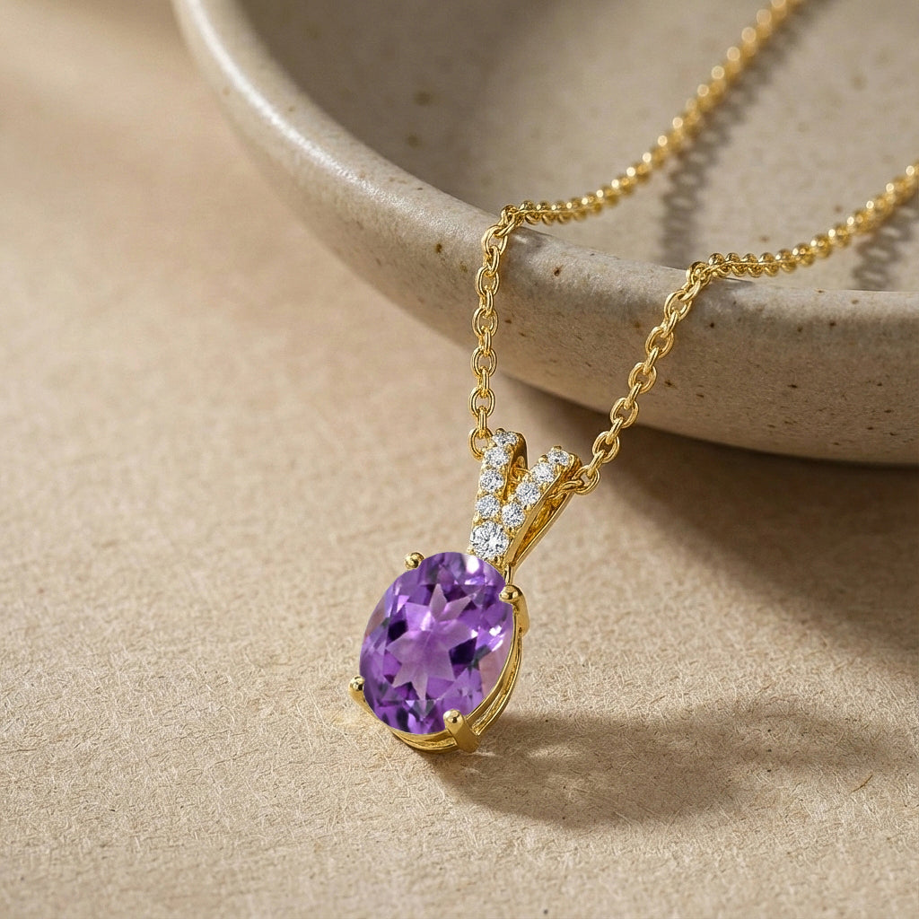 Add vibrant elegance with this Amethyst Solitaire Pendant Necklace in yellow gold-plated brass. Featuring a 1.2 ct, 8×6 mm oval-cut amethyst (approx. 1.5 ct CZ accent), the pendant measures 15.81 × 6.84 mm and is finely faceted for sparkling brilliance. It hangs from a 16"+2" adjustable cable chain with a secure lobster clasp. Lightweight at 4 grams with chain, this necklace is perfect for everyday wear, layering, or gifting a timeless amethyst jewelry piece.