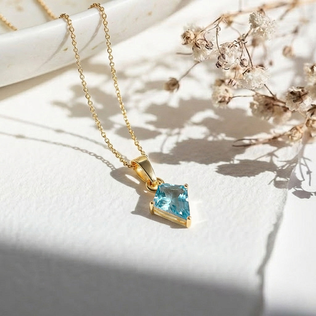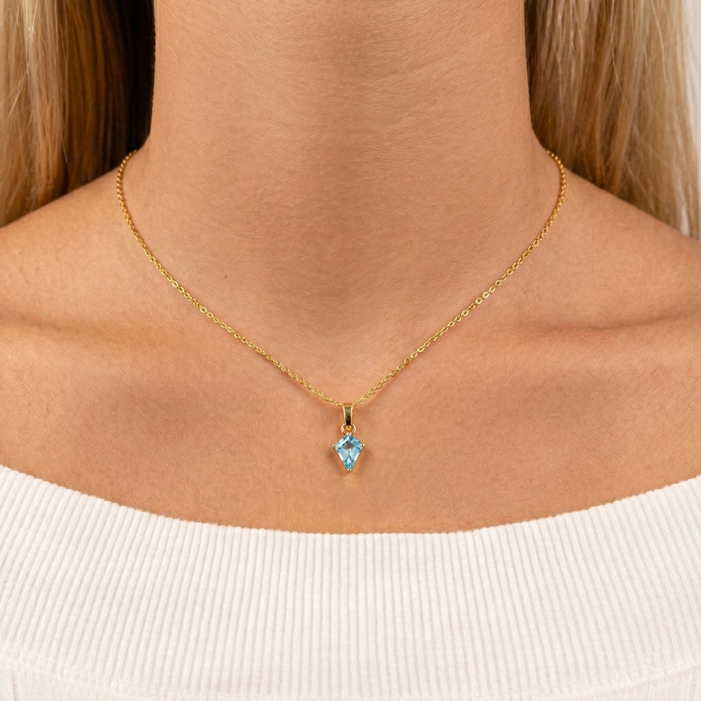 Add a touch of serene elegance with this Aquamarine Kite Solitaire Pendant Necklace in yellow gold-plated brass. Featuring a 1.40 ct kite-cut aquamarine on a 16"+2" cable chain, this lightweight 3.7g necklace is perfect for everyday wear or gifting a timeless aquamarine jewelry piece.