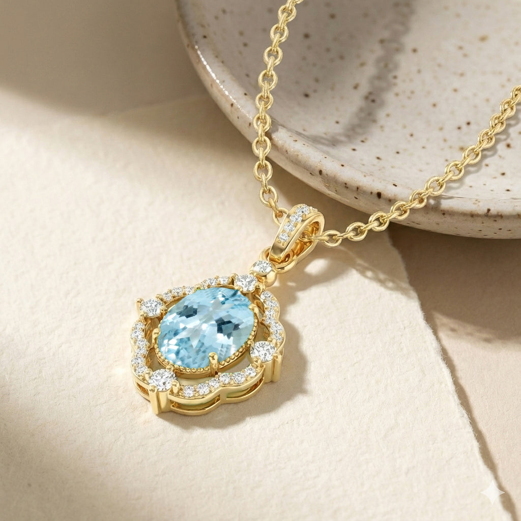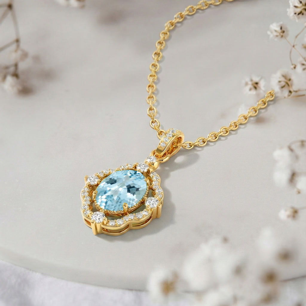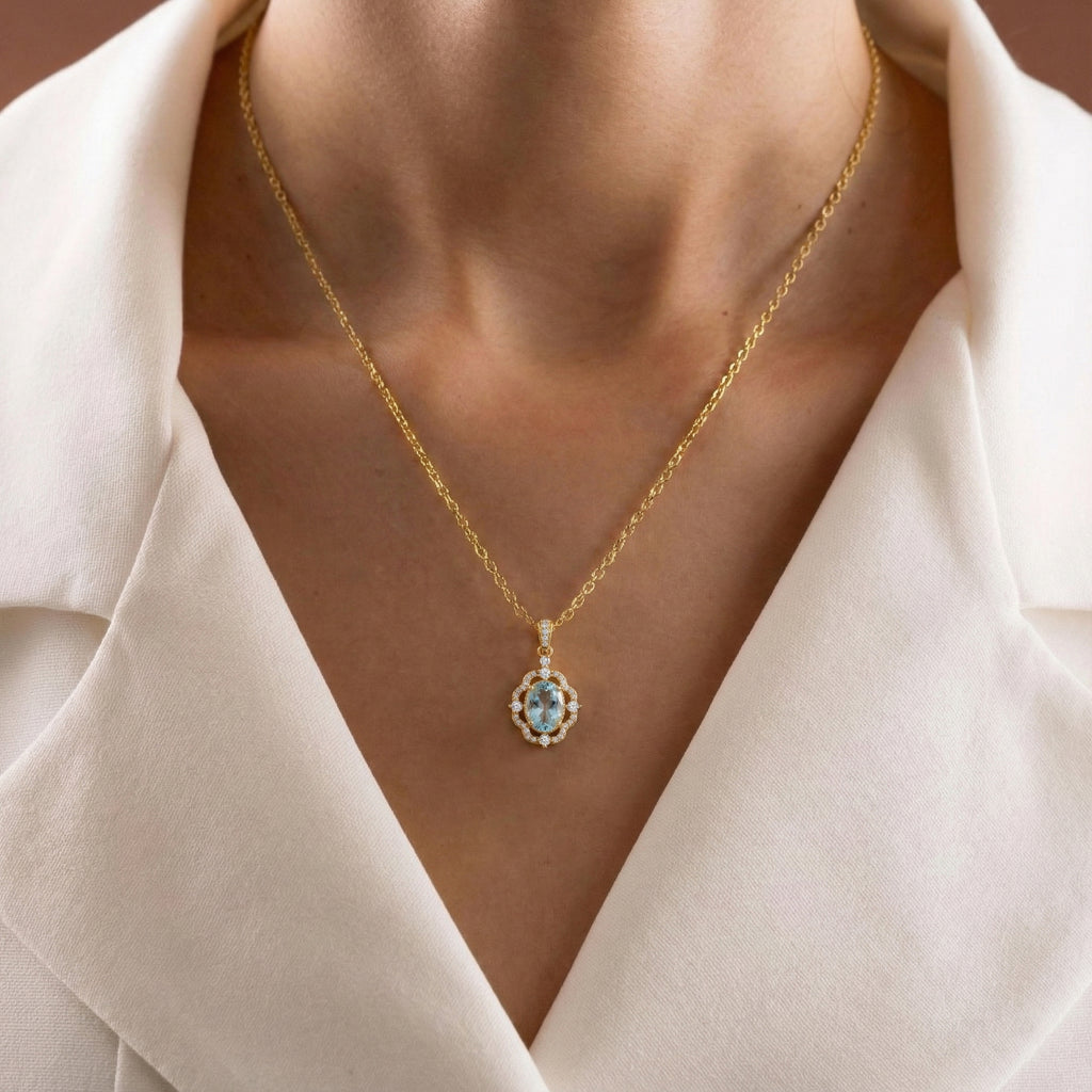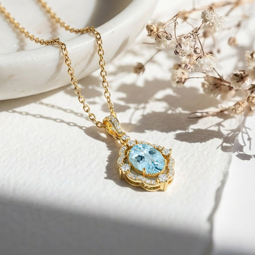 Add a serene sparkle with this Aquamarine Oval Halo Pendant Necklace in yellow gold-plated brass. Featuring a 1.2ct faceted oval aquamarine surrounded by shimmering CZ stones, the 25x12mm pendant hangs on a 16"+2" adjustable cable chain. Lightweight at 3.5g, it’s a versatile piece perfect for everyday elegance or special occasions, making it a thoughtful gift for her.