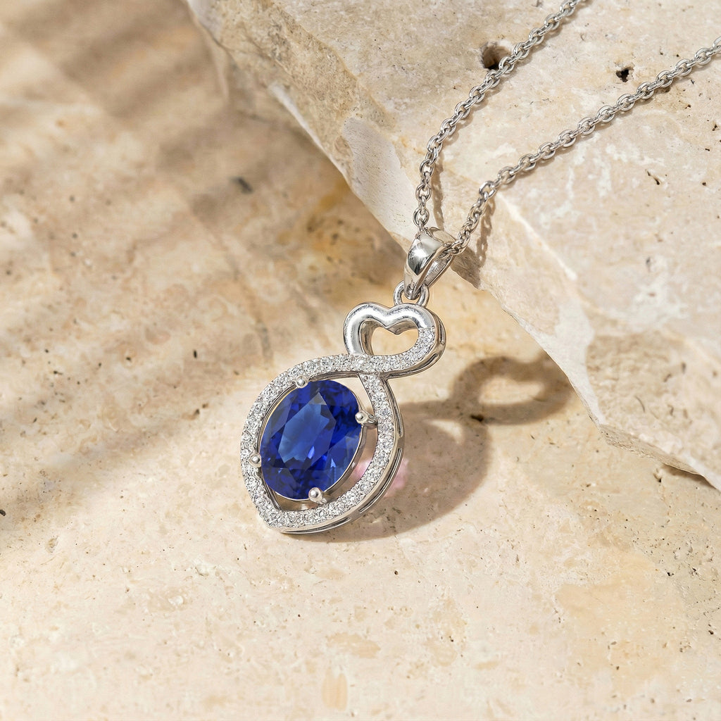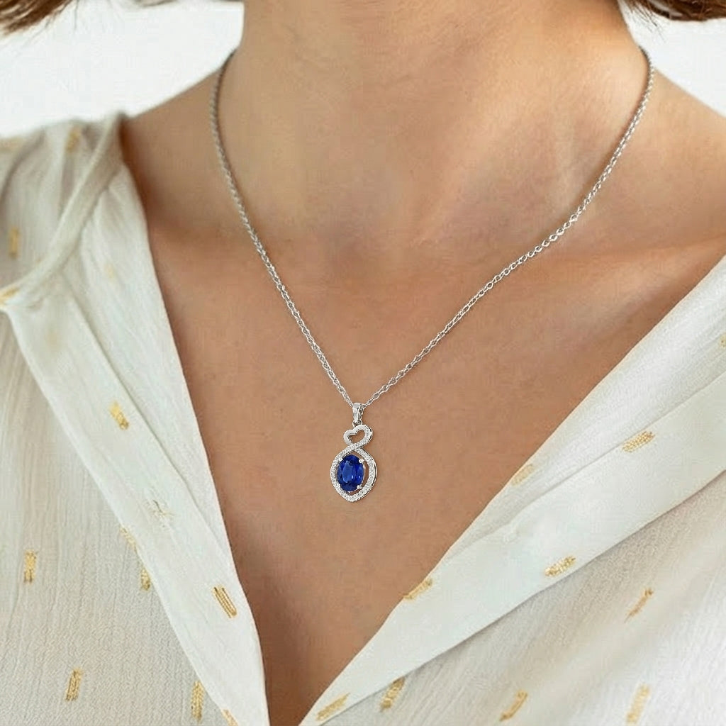 Blue Sapphire Oval Infinity Twist Heart Pendant Necklace in 925 Sterling Silver features a 1.2ct oval-cut blue sapphire (8x6mm) set in a stunning infinity twist heart design, accented with 2ct sparkling cubic zirconia. The pendant measures 24.55 x 11.64mm and hangs from a 16” + 2” adjustable cable chain with a secure lobster clasp. Crafted from premium sterling silver, this elegant necklace offers rich blue hues, timeless sophistication, and everyday comfort—perfect for gifting or adding a romantic, eye-catching statement to any jewelry collection.