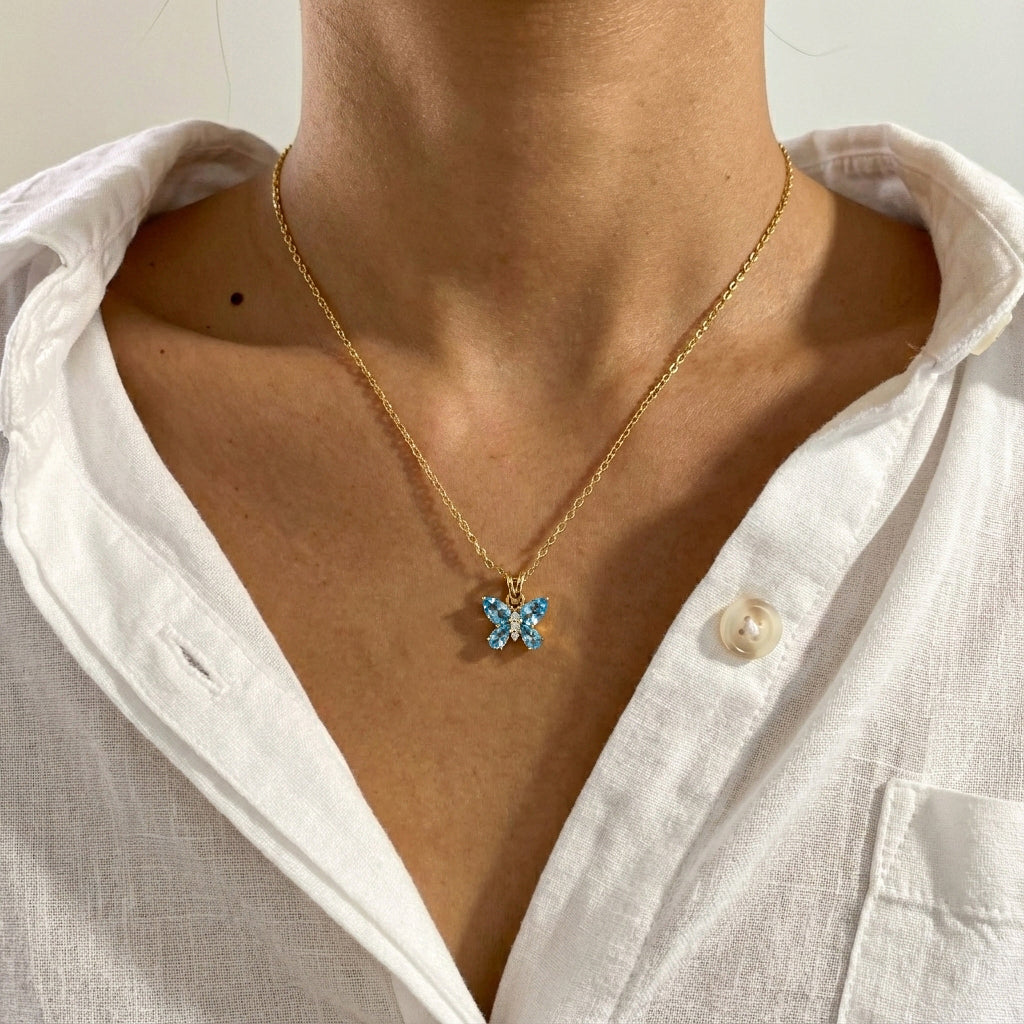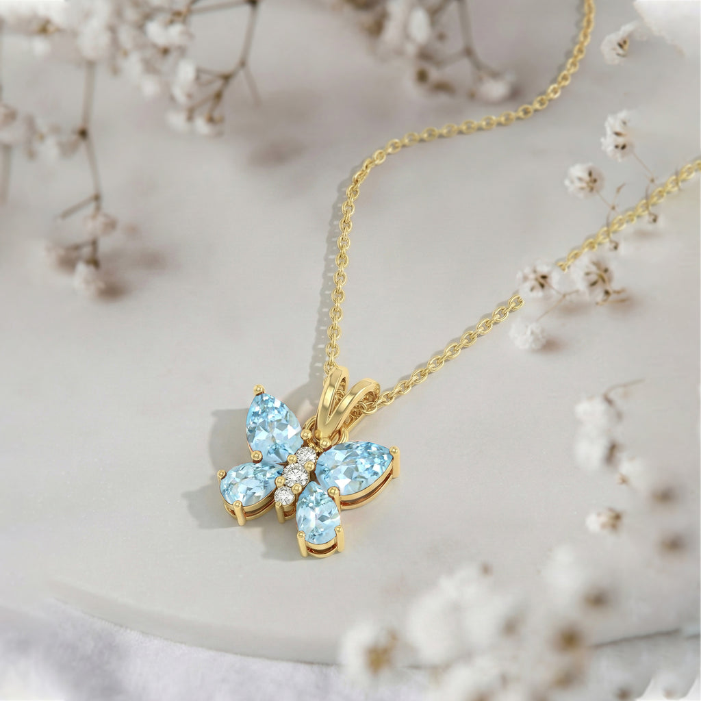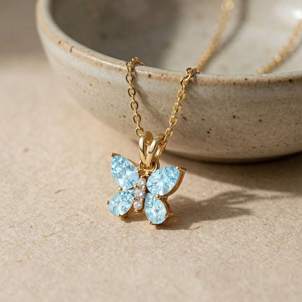 Elegant and refreshing, this butterfly pendant necklace features faceted pear-cut aquamarine gemstones set in yellow gold plated brass. Four soft blue aquamarines totaling approximately 2 carats create a luminous sparkle. The pendant measures 10.80 x 12.57 mm and hangs from a 16” + 2” adjustable cable chain with a secure lobster clasp. Lightweight and timeless, this necklace adds graceful charm to both everyday and special-occasion looks.