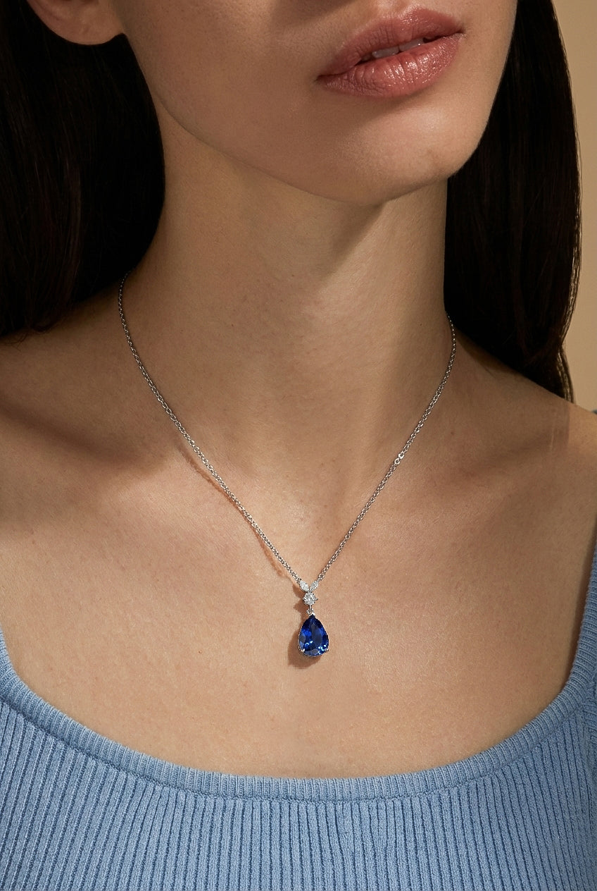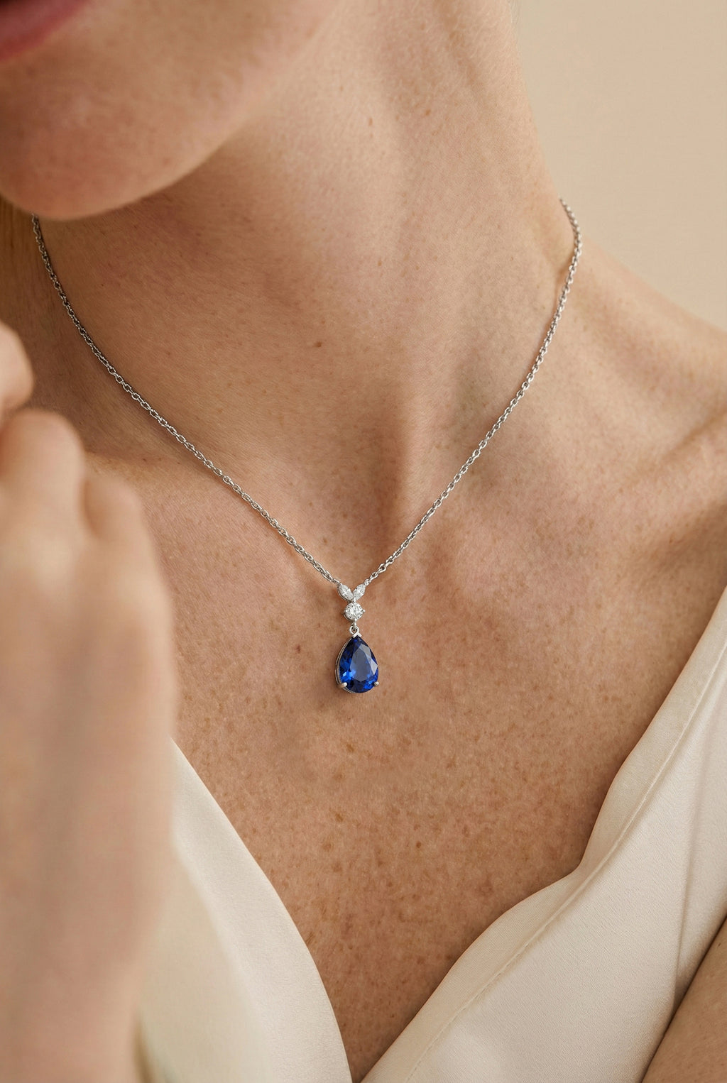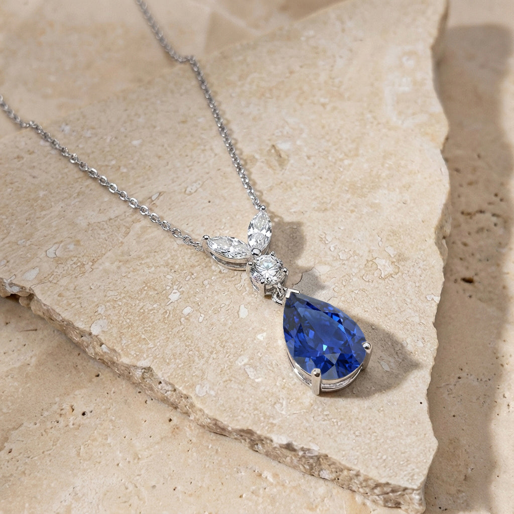 This Blue Sapphire Pear Teardrop Pendant Necklace is crafted in 925 sterling silver and features a 1.70 CT faceted pear-shaped Blue Sapphire (10x7 mm). The pendant measures 21.06 x 7.31 mm and weighs approximately 1.70 g. It includes a 16” + 2” adjustable sterling silver cable chain with a secure lobster clasp. A classic blue gemstone necklace offering timeless elegance and brilliance.