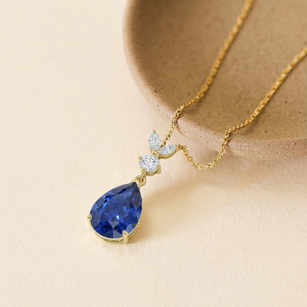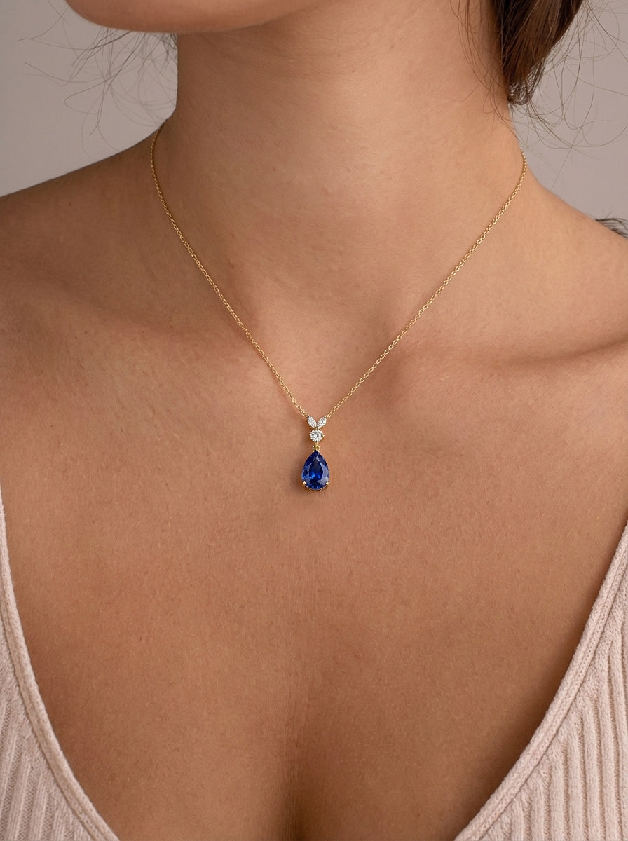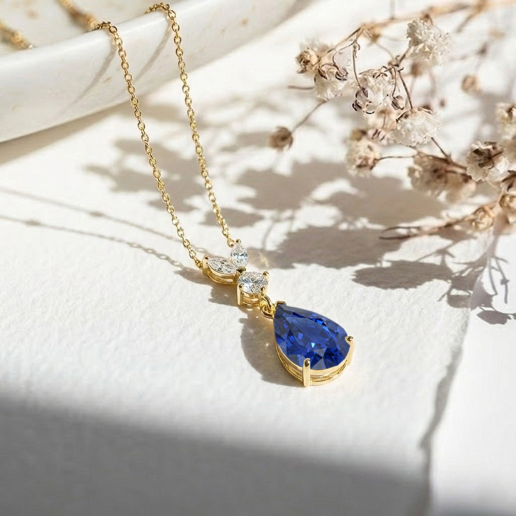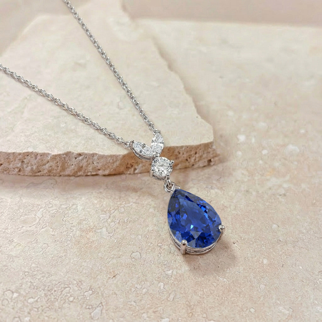 This Blue Sapphire Pear Teardrop Pendant Necklace is crafted in 925 sterling silver and features a 1.70 CT faceted pear-shaped Blue Sapphire (10x7 mm). The pendant measures 21.06 x 7.31 mm and weighs approximately 1.70 g. It includes a 16” + 2” adjustable sterling silver cable chain with a secure lobster clasp. A classic blue gemstone necklace offering timeless elegance and brilliance.