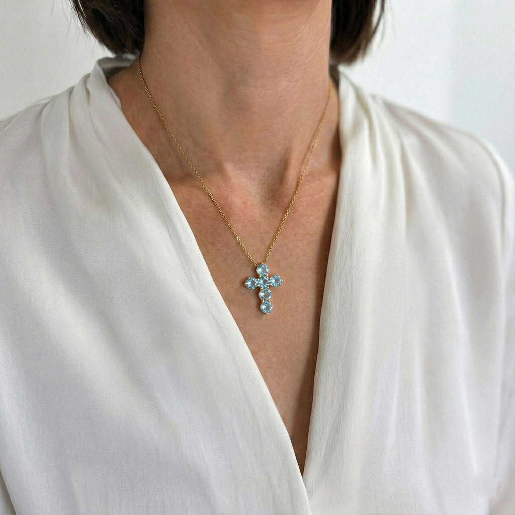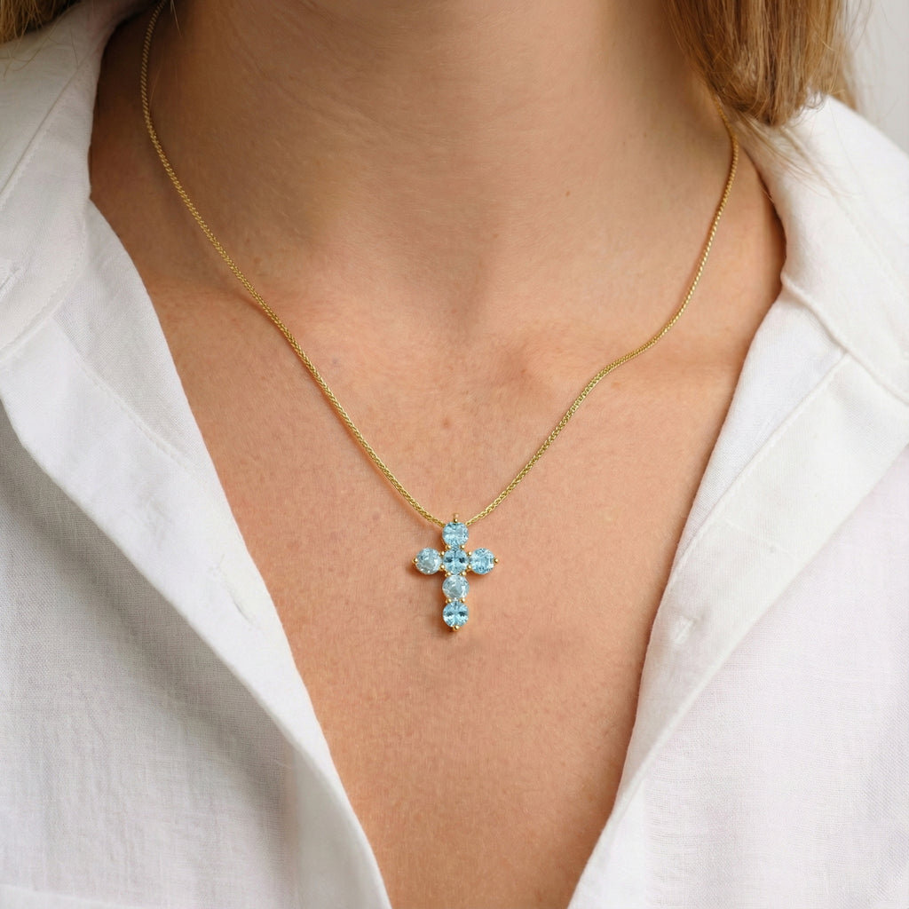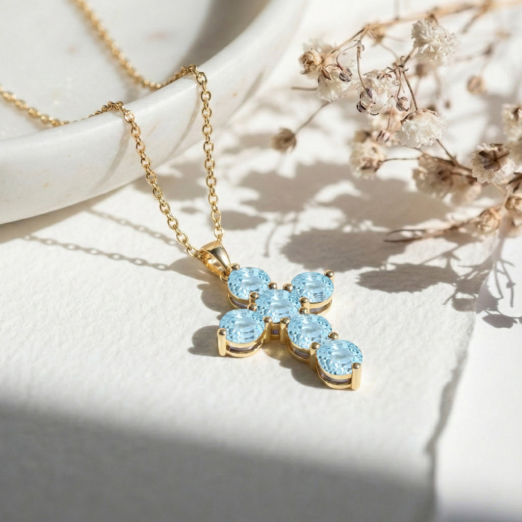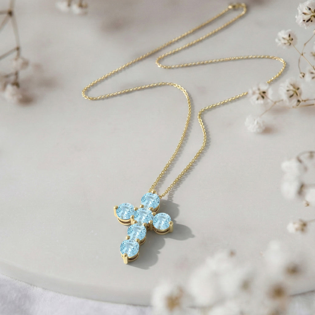 Serene and elegant, this cross pendant necklace features six faceted round aquamarine gemstones (5 mm each) set in yellow gold plated brass. With a total carat weight of approximately 3.90 CT, the soft blue stones create a luminous, sparkling effect. The pendant measures 23.72 x 18.04 mm and hangs from a 16” + 2” adjustable cable chain with a secure lobster clasp. Weighing 7.50 gm with chain, this necklace adds a refined touch to both everyday and special-occasion outfits.