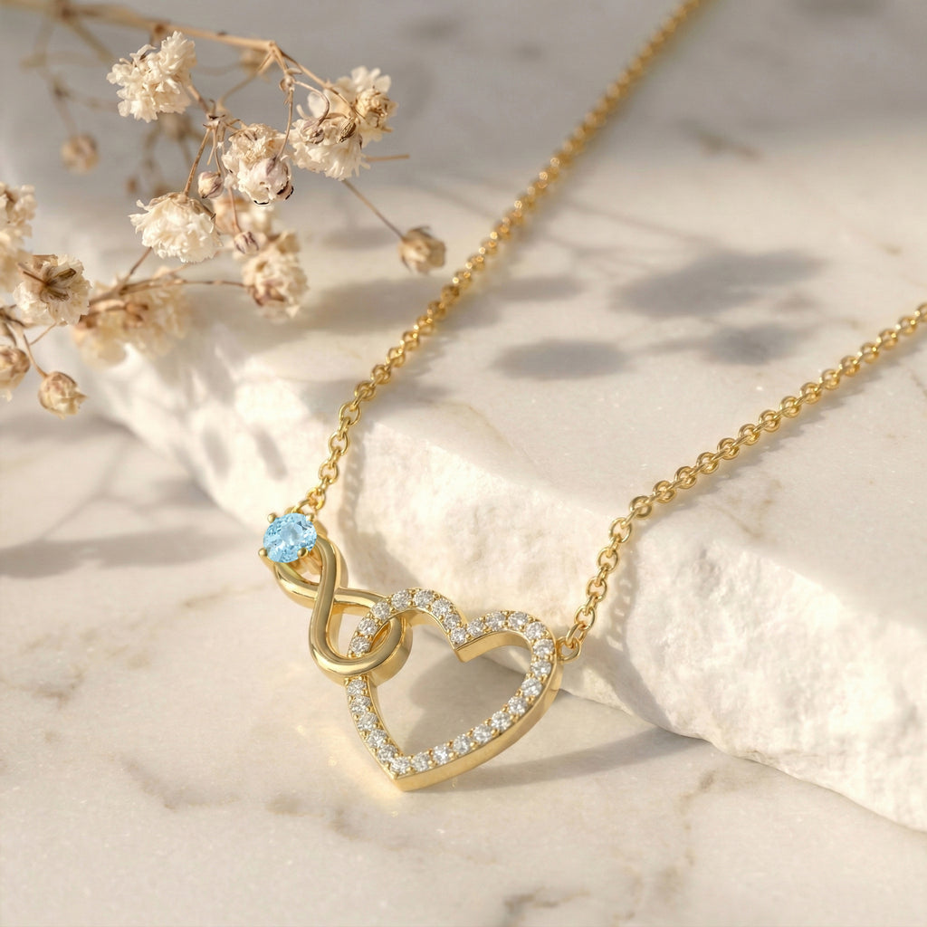 Embrace elegance with this Aquamarine Round Infinity Heart Pendant Necklace in yellow gold-plated brass. Featuring a 0.45 ct, 4 mm round faceted aquamarine, the pendant measures 31.94 x 17.64 mm and hangs on a 16"+2" adjustable cable chain. Weighing 8 g with chain, it’s perfect for daily wear or special occasions. The sparkling aquamarine paired with the romantic infinity heart design makes this necklace a thoughtful gift for anniversaries, birthdays, or celebrating love.