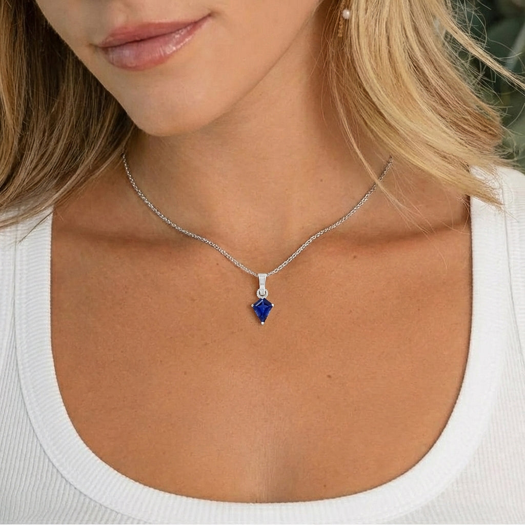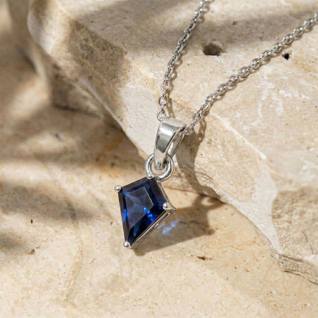 Blue Sapphire Solitaire Kite Pendant Necklace in 925 Sterling Silver 1.4ct showcases a stunning 9x7mm kite-shaped faceted blue sapphire with deep, rich color. The pendant measures 18.20 x 7.40mm and hangs gracefully from a 16” + 2” adjustable cable chain secured with a lobster clasp. Crafted from premium sterling silver and weighing 3.7 grams with the chain, this elegant necklace offers timeless sophistication, vibrant sparkle, and everyday comfort—perfect for gifting or elevating any jewelry collection.