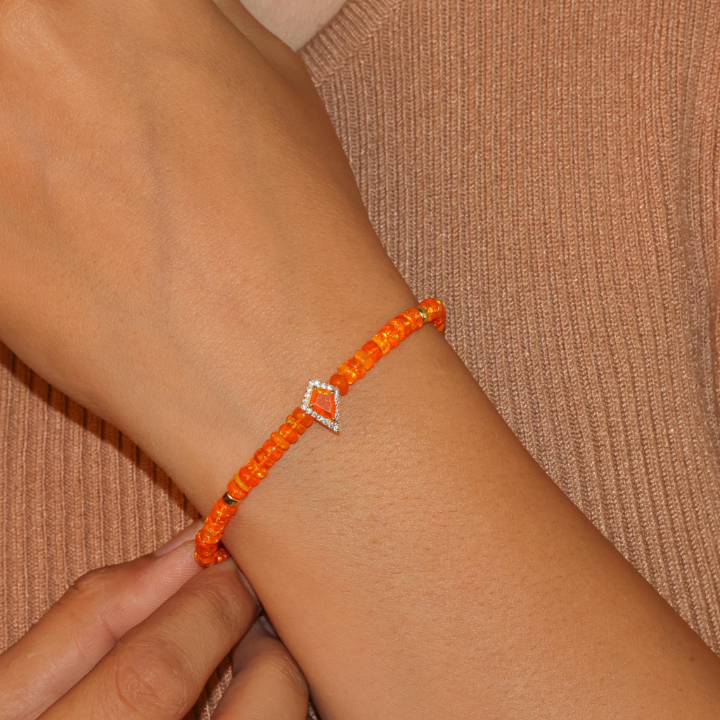 Every bracelet is hand-set with natural orange opal stones in a kite shape, and complemented by zircon stones that sparkle and gleam. These are accompanied by well-finished circular golden beads in circular shapes to give a warm and classy touch. The stones are carefully chosen to reflect the best color and quality and no two bracelets are the same.