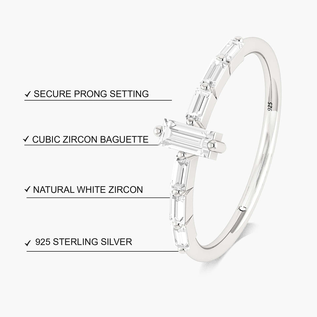 Beautiful and charming, this magnificent piece has seven sparkling zircons set in a classic baguette design. The prong setting lets the most light bounce off the stones while guaranteeing that each zircon is secured firmly. available in a range of sizes to ensure that every finger fits flawlessly.