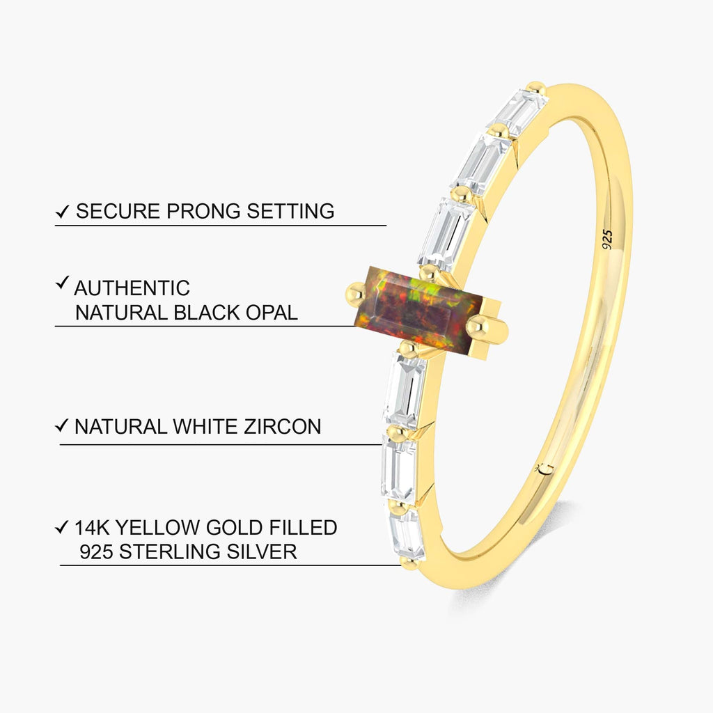 Let your jewelry speak for itself by purchasing the Baguette Black Opal & Zircons Ring right now!