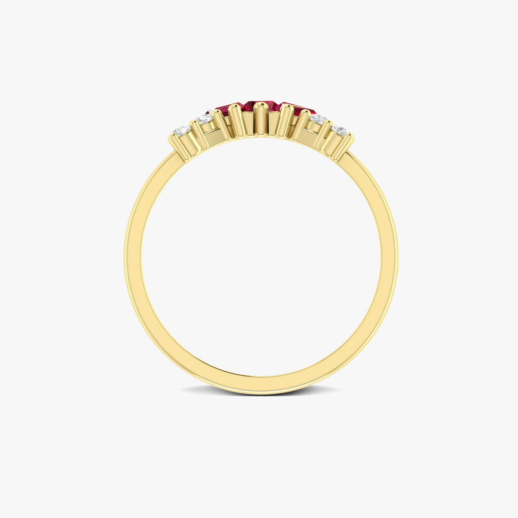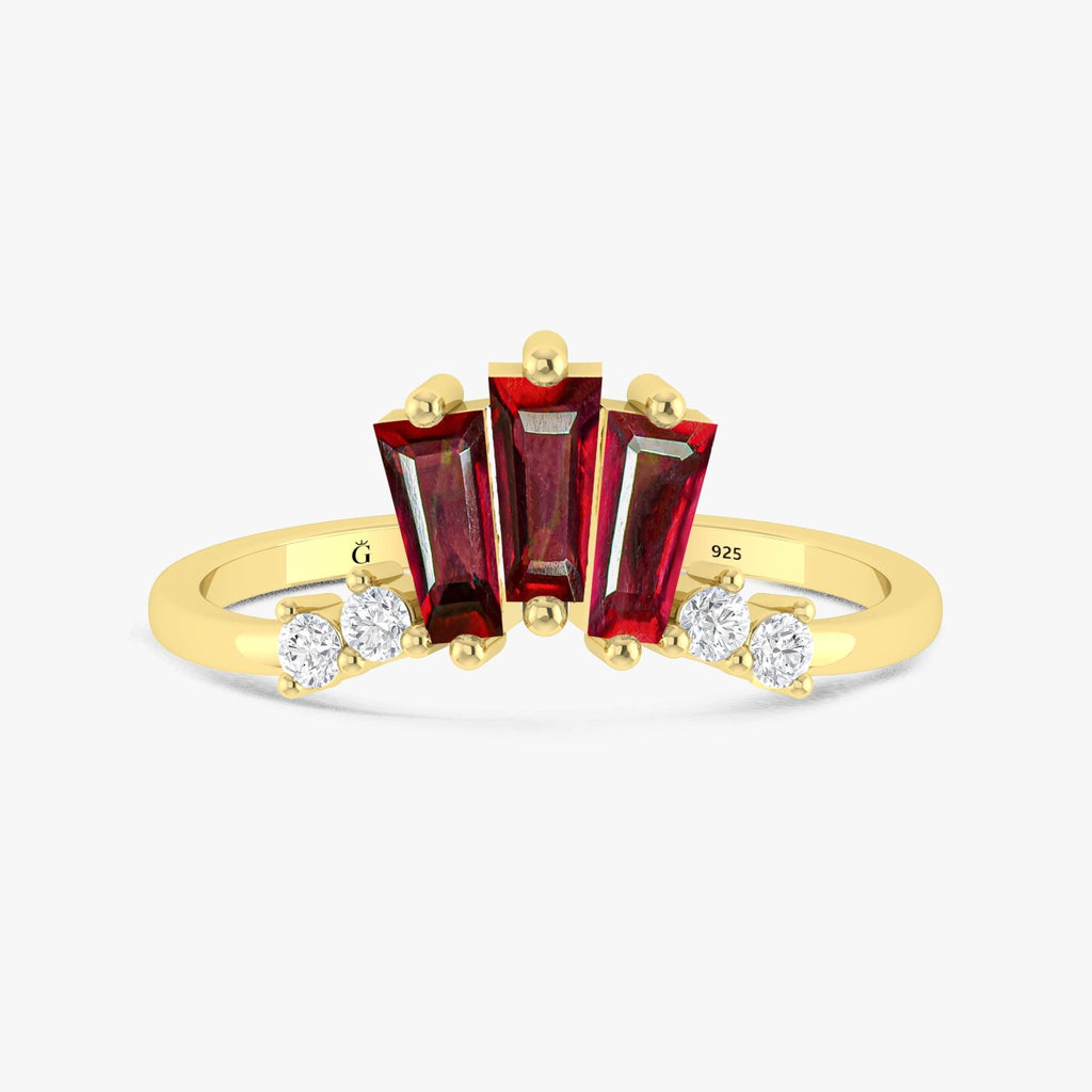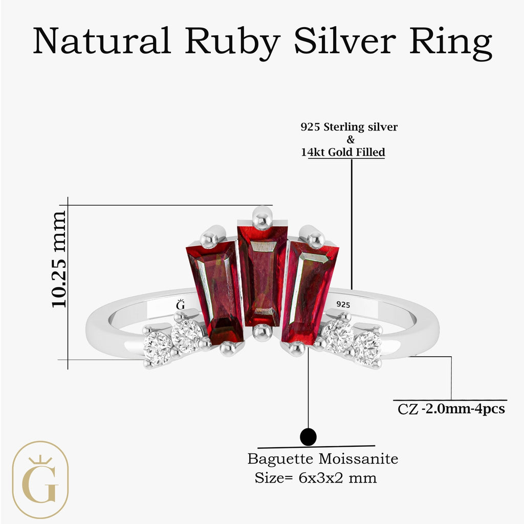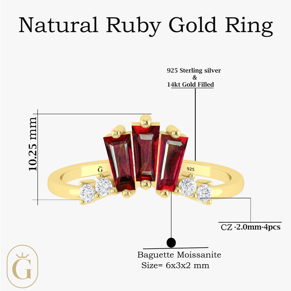 With our gorgeous Natural Ruby Gold Ring, you can up your style ante. This ring is a work of art in terms of design and craftsmanship, with brilliant baguette-cut ruby moissanite stones and sparkling CZ accents.