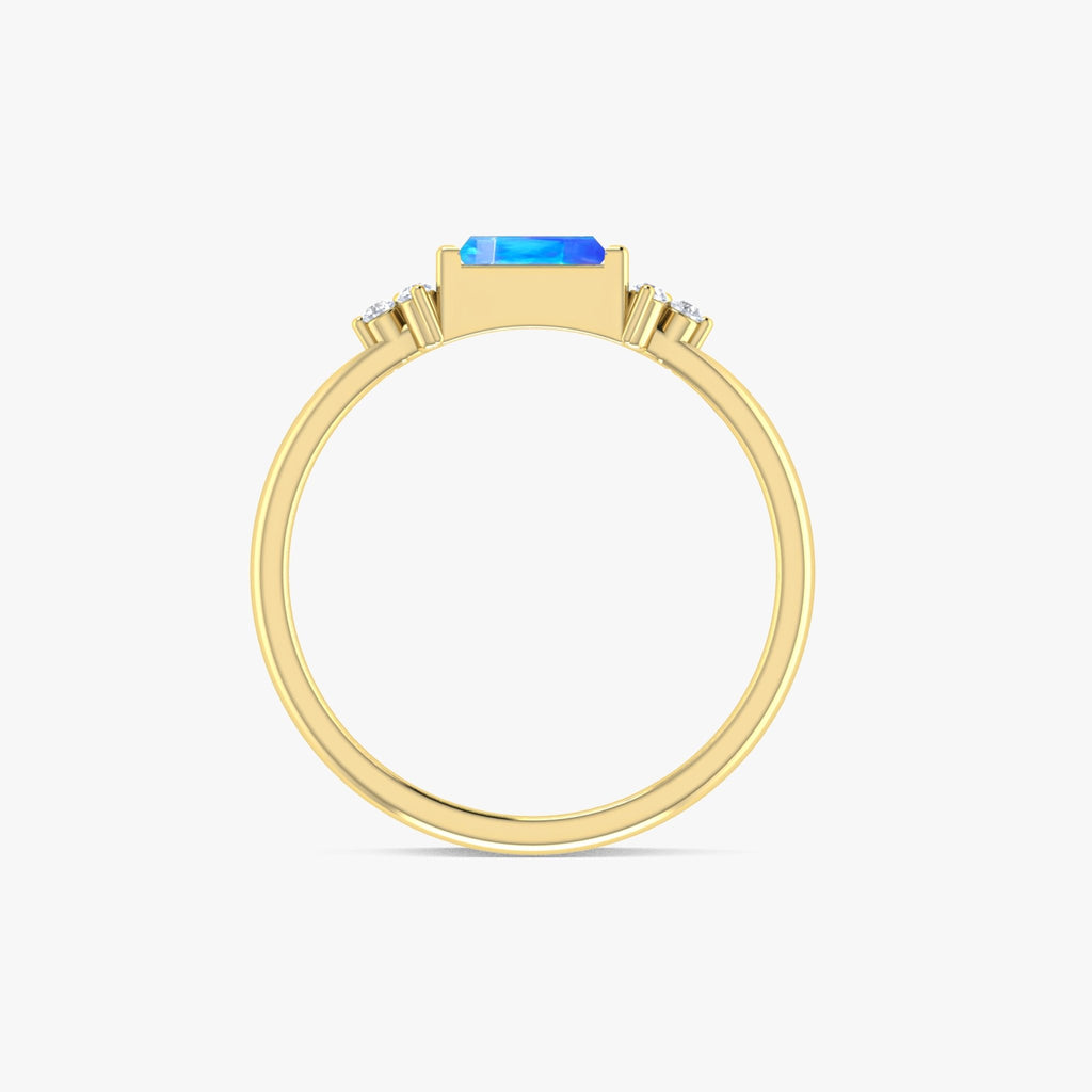 Blue OpalNatural Blue Opal Designer Ring, a timeless blend of luxury, symbolism, and everyday wearability. Featuring a genuine 5x2.5 mm baguette-cut natural Blue opal, this stunning ring showcases a rich play of colors that shift with light, capturing attention and radiating charm. Expertly set in 925 sterling silver with a durable yellow gold filled finish, it offers both elegance and durability in one exquisite piece. Designed with versatility in mind, this Designer ring complements any outfit whether worn alone for a minimalist look or layered with other rings for a bold fashion statement. Its slim, sleek profile makes it perfect for stacking, allowing you to express your personal style effortlessly.