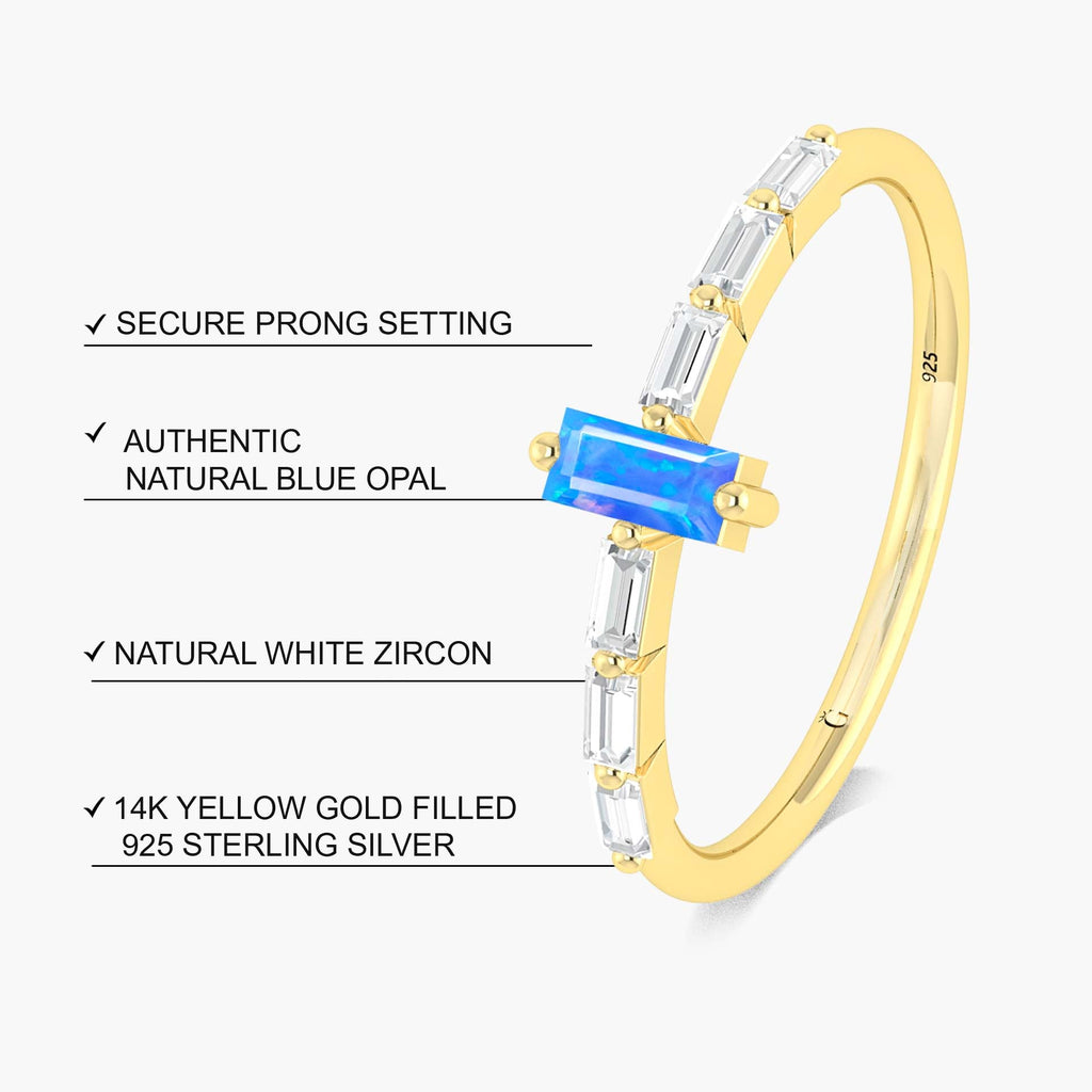 Add the Baguette-shaped blue Opal with Zircon Ring to your collection for a sophisticated and colorful touch.