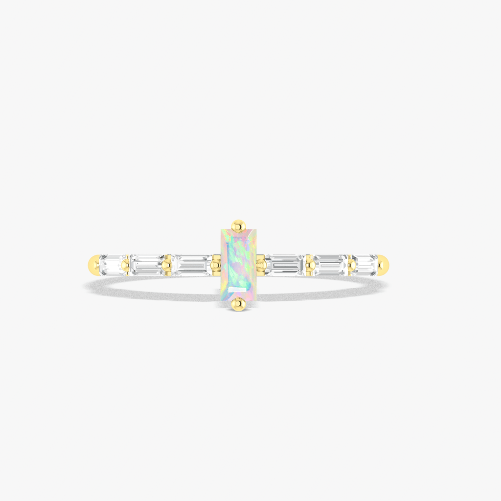 This stunning design blends the sparkle of finely placed zircon accents with the ethereal beauty of a bright white opal centerpiece.