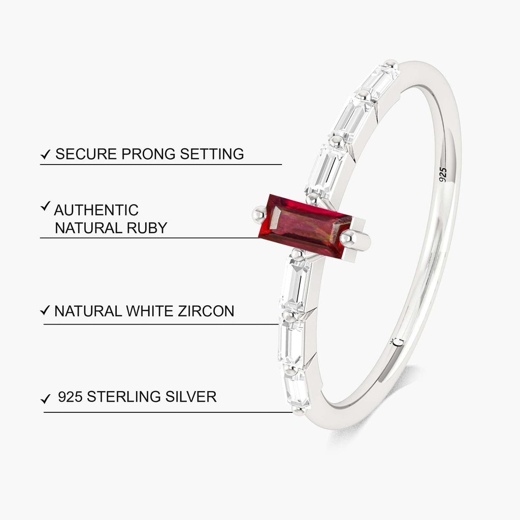 The magnificent baguette-cut ruby in the center of this ring, which represents passion and love, is encircled by zircon stones that sparkle and provide charm.