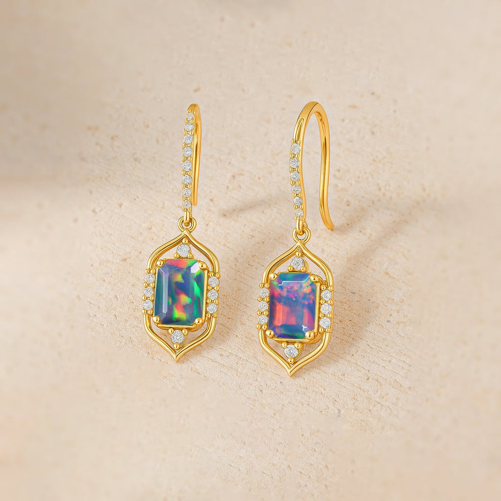 Black OpalElevate your style with these luxurious black opal drop earrings, beautifully crafted with 925 Sterling Silver for a rich and timeless shine. At the heart of each earring sits a radiant AAA black opal gemstone in a 9x7mm octagon cut, glowing with flashes of deep blue, green, and fiery red.
