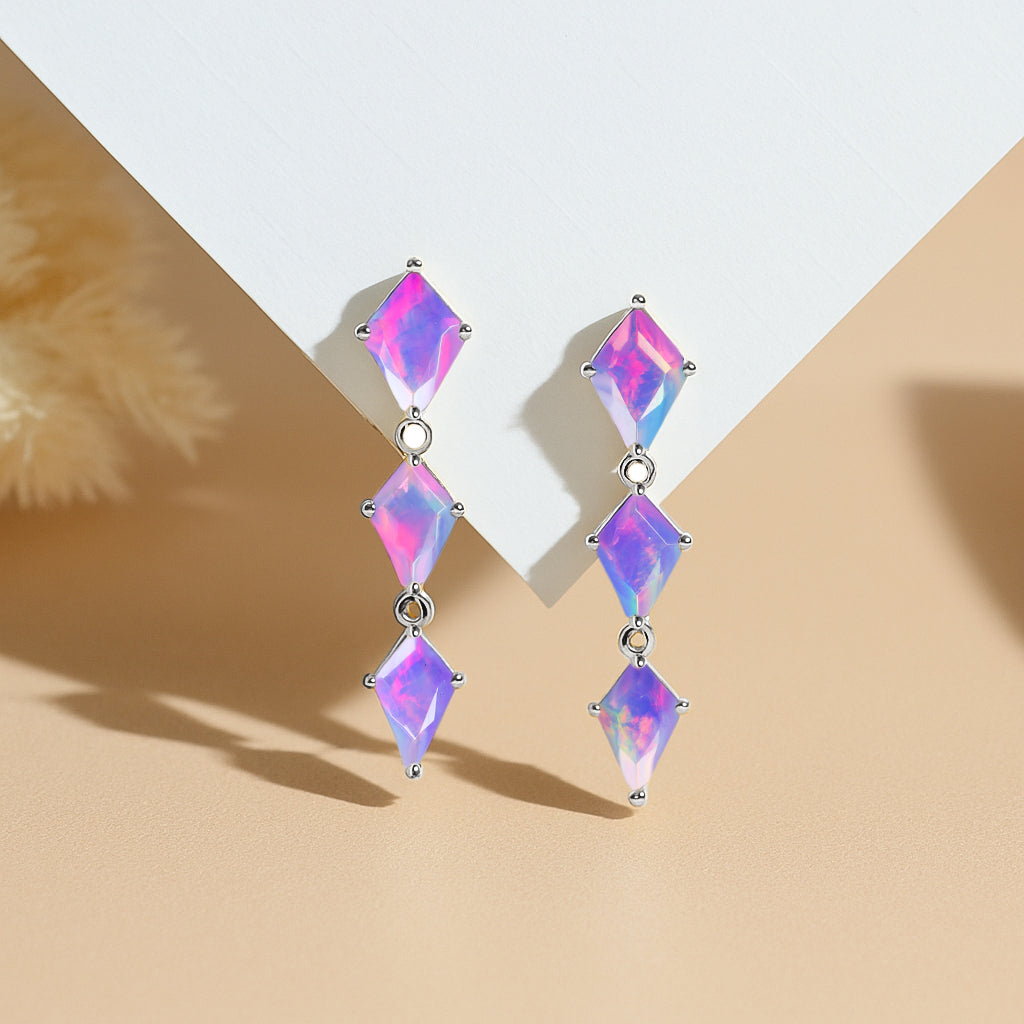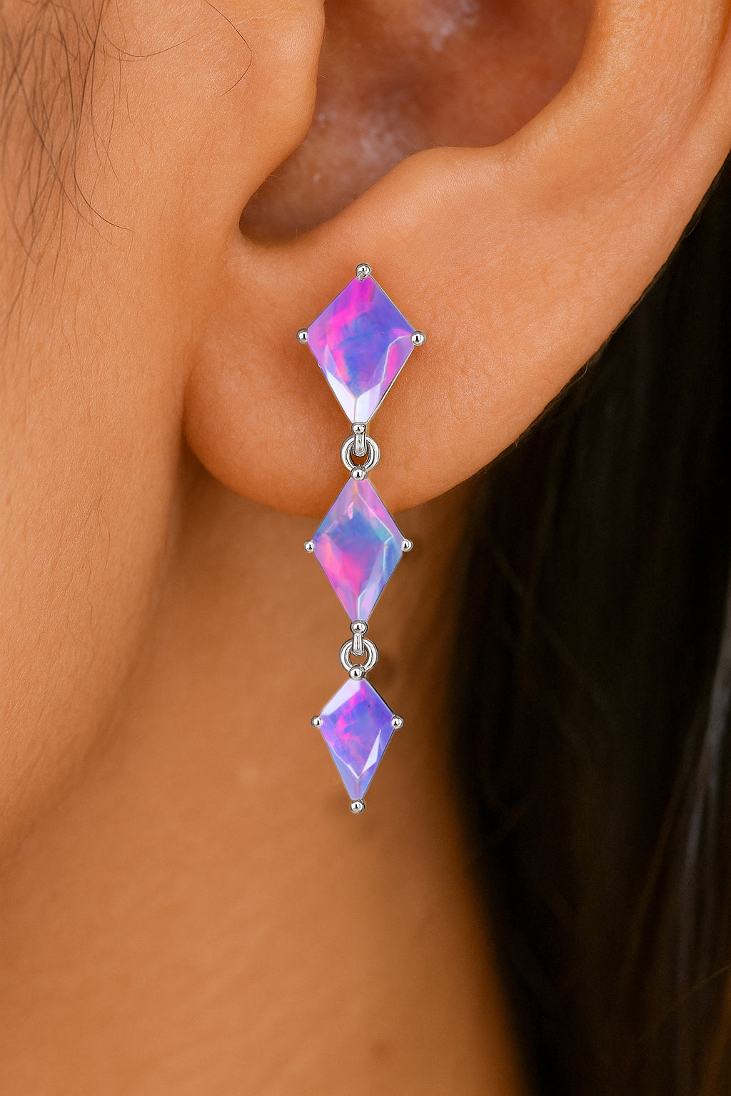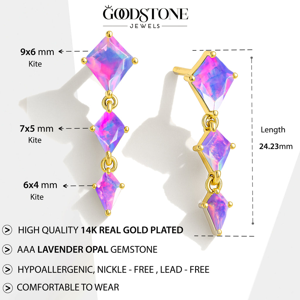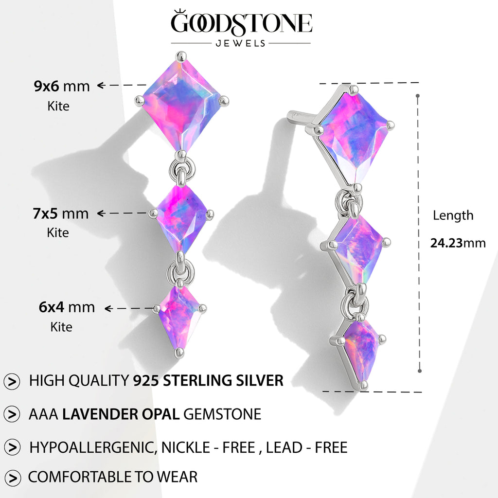 Lavender OpalElevate your style with these Lavender Opal Kite Stone Drop Earrings, crafted in solid 925 sterling silver. Featuring a stunning trio of kite-shaped opal in sizes 6x4 mm, 7x5 mm, and 9x6 mm, this elegant design creates a graceful cascading look. With a total weight of approx. 5.30 crt and a refined size of 24.23x6.33 mm, these earrings offer a luminous shimmer and timeless charm. Lightweight at approx. 4.10 gm, they are perfect for both everyday wear and special occasions.