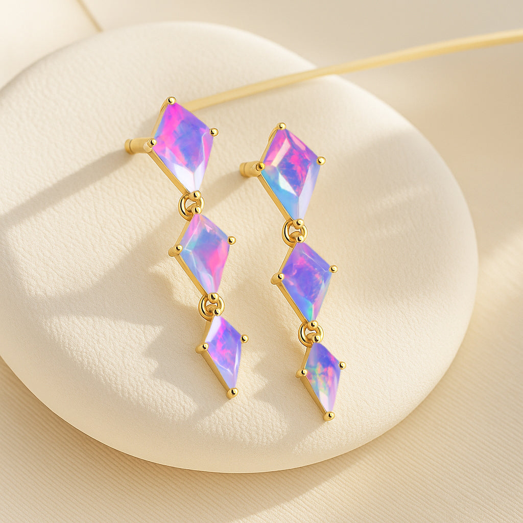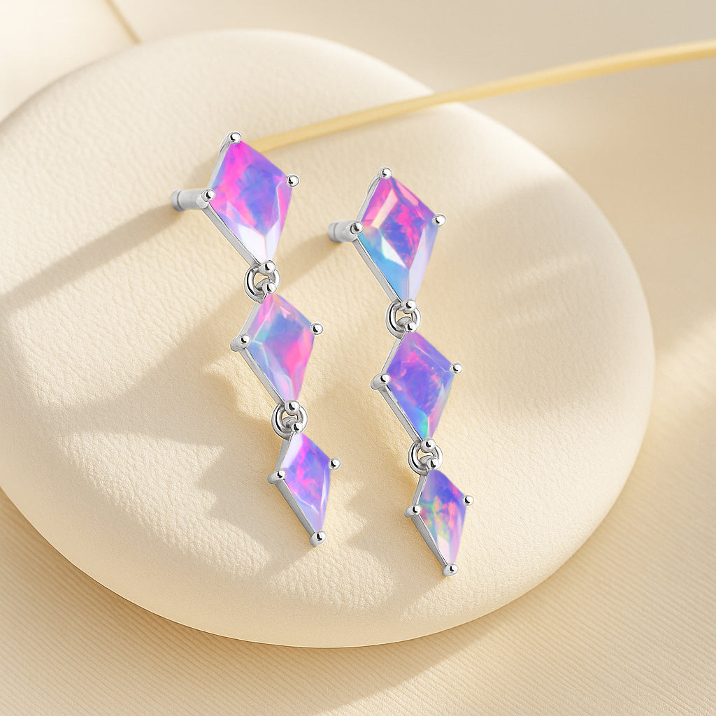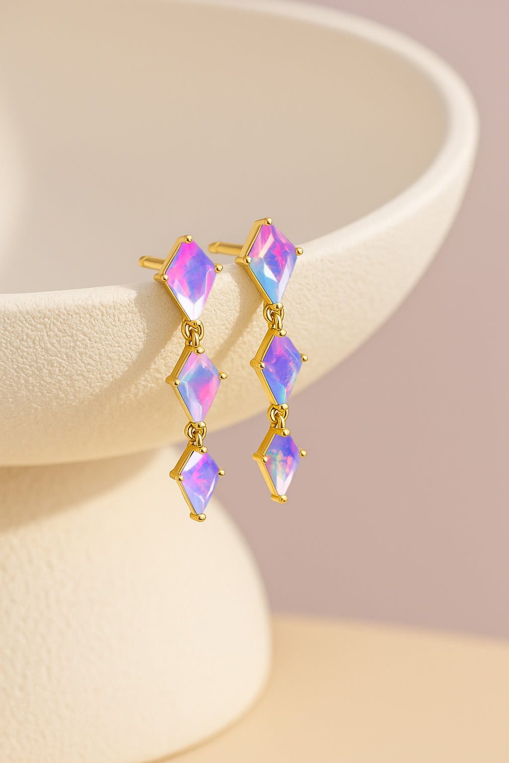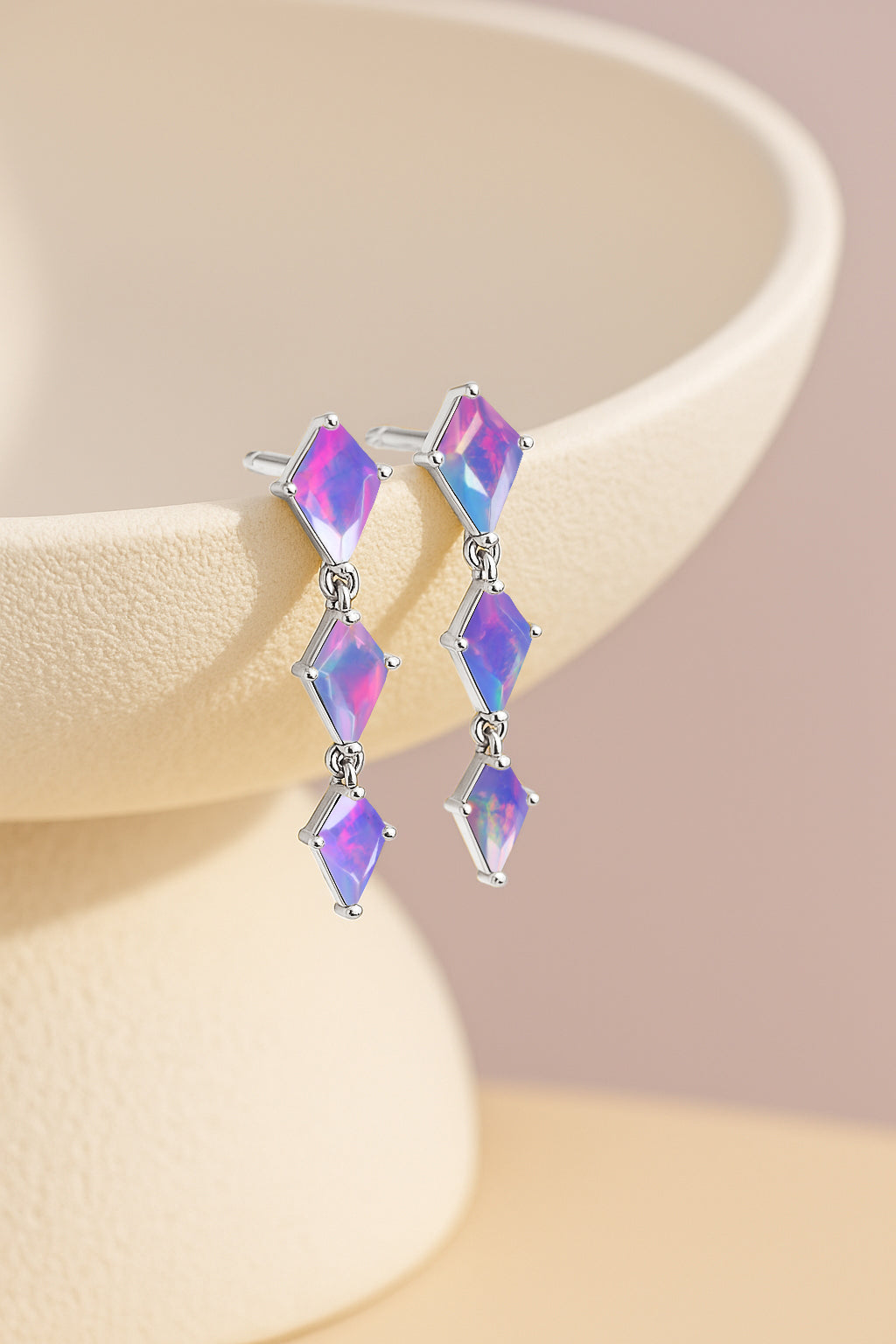 Lavender OpalElevate your style with these Lavender Opal Kite Stone Drop Earrings, crafted in solid 925 sterling silver. Featuring a stunning trio of kite-shaped opal in sizes 6x4 mm, 7x5 mm, and 9x6 mm, this elegant design creates a graceful cascading look. With a total weight of approx. 5.30 crt and a refined size of 24.23x6.33 mm, these earrings offer a luminous shimmer and timeless charm. Lightweight at approx. 4.10 gm, they are perfect for both everyday wear and special occasions.
